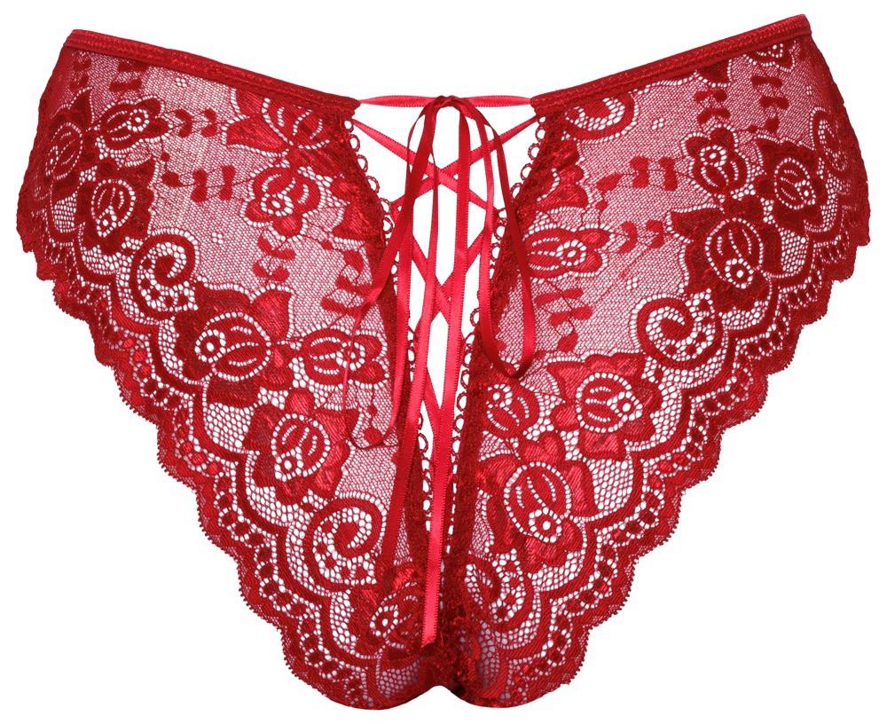 Lavishly crafted crotchless panties by Cottelli LINGERIE made from red floral lace. Soft and elastic for high wearing comfort. With cut-out front and inviting crotch. With variable satin ribbon lacing above the buttocks.