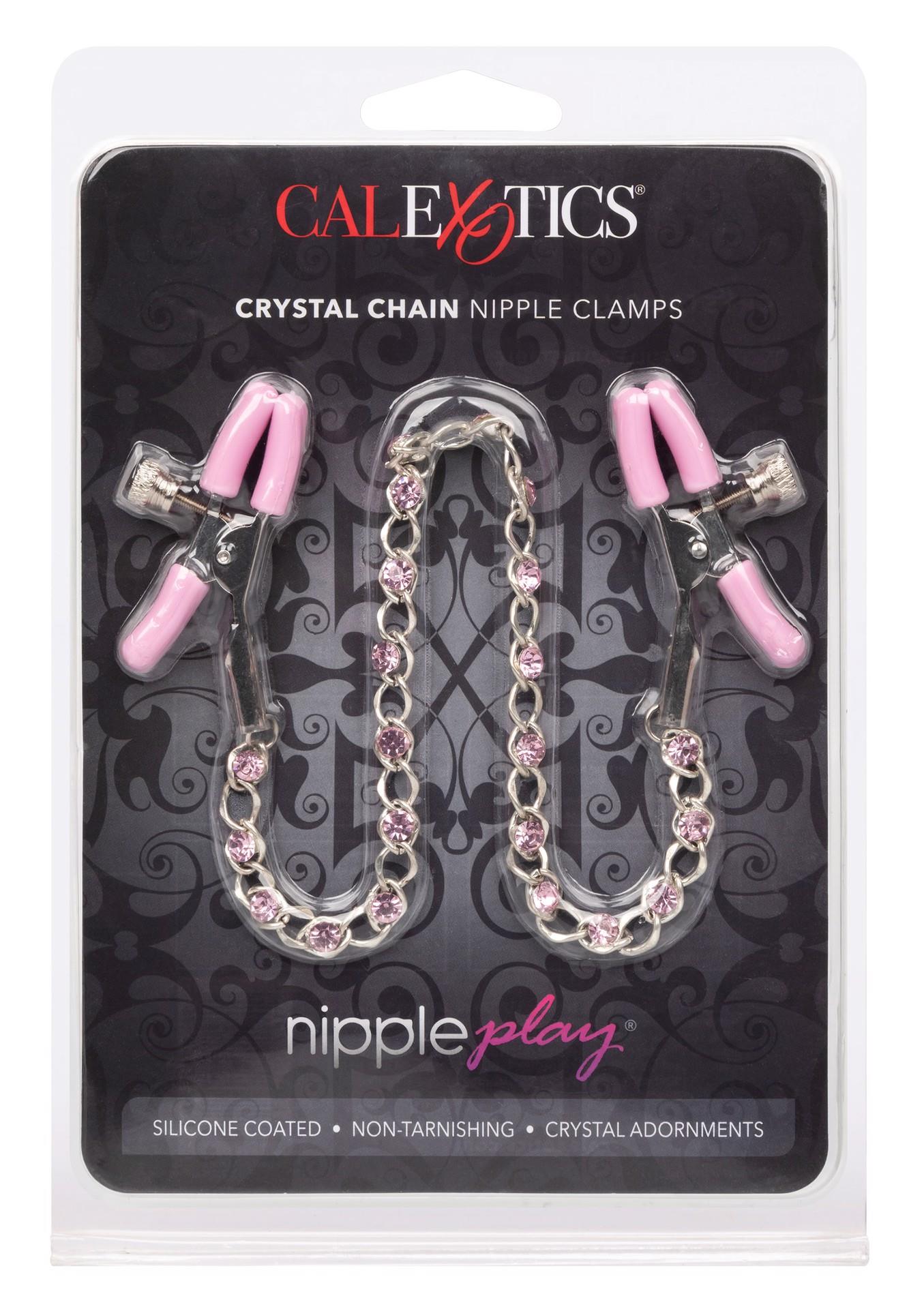 Push sensation to the next level and enjoy teasing nipple play with the Nipple Play Crystal Chain Nipple Clamps; Explore elevated sensation with the 2 fully adjustable nipple clamps, teasing chain and sparkling crystals. Reach new levels of playful pleasure with the adjustable clamps; Clamp the naughty clasps to your body and enjoy every rush of pain and pleasure.