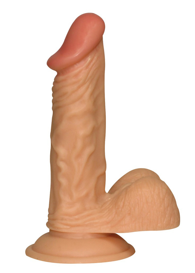 Dildo z jądrami i bazą ssącą. Długość 17 cm, Ø 3-4 cm. Kolor skóry. Materiał: PVC.