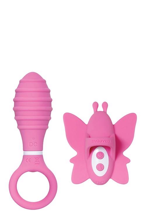 Double dating has never felt this good! A combination of toys that will send you over the edge of bliss with intense clitoral vibrations and buzzworthy anal pleasure waves. Both toys have comfortable finger loops for easy ergonomic handling as their powerful motors amp up through 10 speeds each. Control each toy separately or use the butterfly’s controls to operate both toys at once. It’s a tantalizing combination of sensations that work together in harmony to bring your clitoral and anal erogenous zones through the gates of paradise!Two toys that work together or separatelyVibrating butt plug with ringed textures for added pleasureVibrating butterfly clitoral stimulator with raised lines for pleasureBoth toys made from creamy smooth siliconeControls and details made from durable ABS plasticFinger ring on both toys for easy ergonomic handling10 powerful functions in each motorEach toy has its own controls, or butterfly can control bothDimensions:Plug: Height: 12,1 cm, Depth: 3,9 cm Width: 4,7 cmButterfly: Height: 8,9 cm, Depth: 5,3 cm, Width: 7,2 cm, Weight: 119 gramRechargeable, USB cable includedWaterproof & submersibleClean butterfly with toy cleaner & warm water rinseClean plug with toy cleaner & hot water rinse