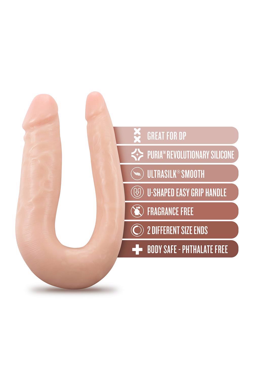 The doctor will see you now! The Dr. Skin Silicone Mini Double Dong is open for practice, ready to aid you in exploring creative possibilities. This soft, U-shaped toy flexes and curves, making it ideal for double penetration or for comfortable use between partners. Grip its U-shape curve and move both heads for blended pleasure! Featuring 2 different-sized ends for comfort: slim on one side, and average girth on the other. Made of body-safe Puria™ platinum-cured silicone and enveloped in satin smooth Ultrasilk®. Contains No Fragrances, Phthalates, Paraffins, or Latex and is easy to clean!Meticulously handcrafted for a realistic look and better than real feelU-shape makes for an easy grip handle Shaped for double penetrationPure platinum cured Puria™ silicone, ultrasilk® smoothLab tested and verified body safeWater based, hybrid lube safeTotal length 12.5 inch / 31,75 cm Width 1.5 inch / 3,8 cm at the wide end Widh 1 inch / 2,5 cm at the narrow end
