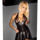 Krótka sukienka marki NOIR o dopasowanym kroju z rozszerzaną spódnicą. W kolorze czarnym szlachetne połączenie miękkiego powernetu z patentowymi detalami (górna część) i powerwetlook (część spódnicowa). Z przodu dwukierunkowy zamek błyskawiczny na całej długości od dekoltu do dołu. Bez pleców – halterneck może być wiązany. Rozkloszowana spódnica jest nieco krótsza z przodu niż z tyłu.