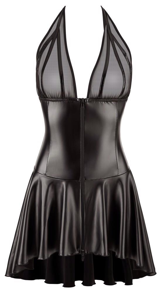 Krótka sukienka marki NOIR o dopasowanym kroju z rozkloszowaną spódnicą. W kolorze czarnym szlachetne połączenie miękkiego powernetu z patentowymi detalami (górna część) i powerwetlook (część spódnicowa). Z przodu dwukierunkowy zamek błyskawiczny na całej długości od dekoltu do dołu. Bez pleców – halterneck może być wiązany. Rozkloszowana spódnica jest nieco krótsza z przodu niż z tyłu.