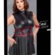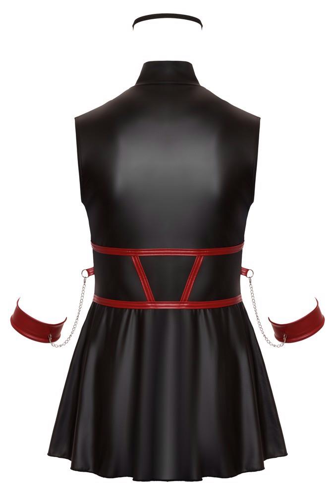 Sleeveless, short dress from Cottelli BONDAGE PLUS in a tight cut with a flared skirt. The dress is completely stretchy and has an elegant black matte look with red contrasting stripes in a waist-accentuating bodice look. Each side has a ring for the two included soft arm cuffs with their snap hook chains. The cuffs are adjustable with hook-and-loop fasteners. Front with full-length 2-way zip that can be opened from the stand-up collar and the seam. A lightly padded eye mask is also included and fully opaque for exciting play.