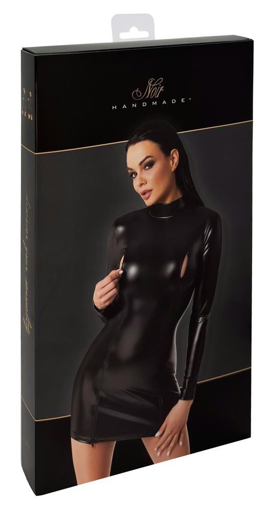 Tight, short, long sleeve dress in a classy black matte look with transparent powernet elements at the front, back and the sides of the skirt. Soft and elastic for a tight fit and high wearing comfort. The standing collar features 2 buttons at the back of the neck and a small cut-out underneath.