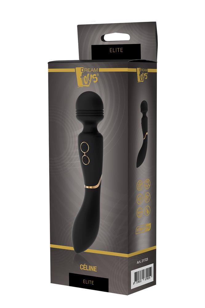 Stymulator różdżki Céline z kolekcji Elite firmy Dream Toys to czarna różdżka ze stylowymi złotymi akcentami, solidną rączką, zaokrągloną główką i lekko elastyczną szyjką. Céline ma 2 mocne silniki, jeden w głowicy i jeden w podstawie, które oferują 7 wzorów wibracji i 3 prędkości. Dwa silniki mogą pracować w tym samym czasie lub oddzielnie. Wibrator różdżkowy Céline można ładować za pomocą dołączonego kabla USB. Wykonany jest z miękkiego silikonu spożywczego i ABS, wodoodporny i bezpieczny dla ciała IPX7, bez ftalanów i lateksu. Obsługę można wykonać za pomocą 2 przycisków: górny przycisk do włączania / wyłączania wibratora i obsługi wibracji w głowicy, dolny przycisk do zmiany programów wibracji silnika dolnego.