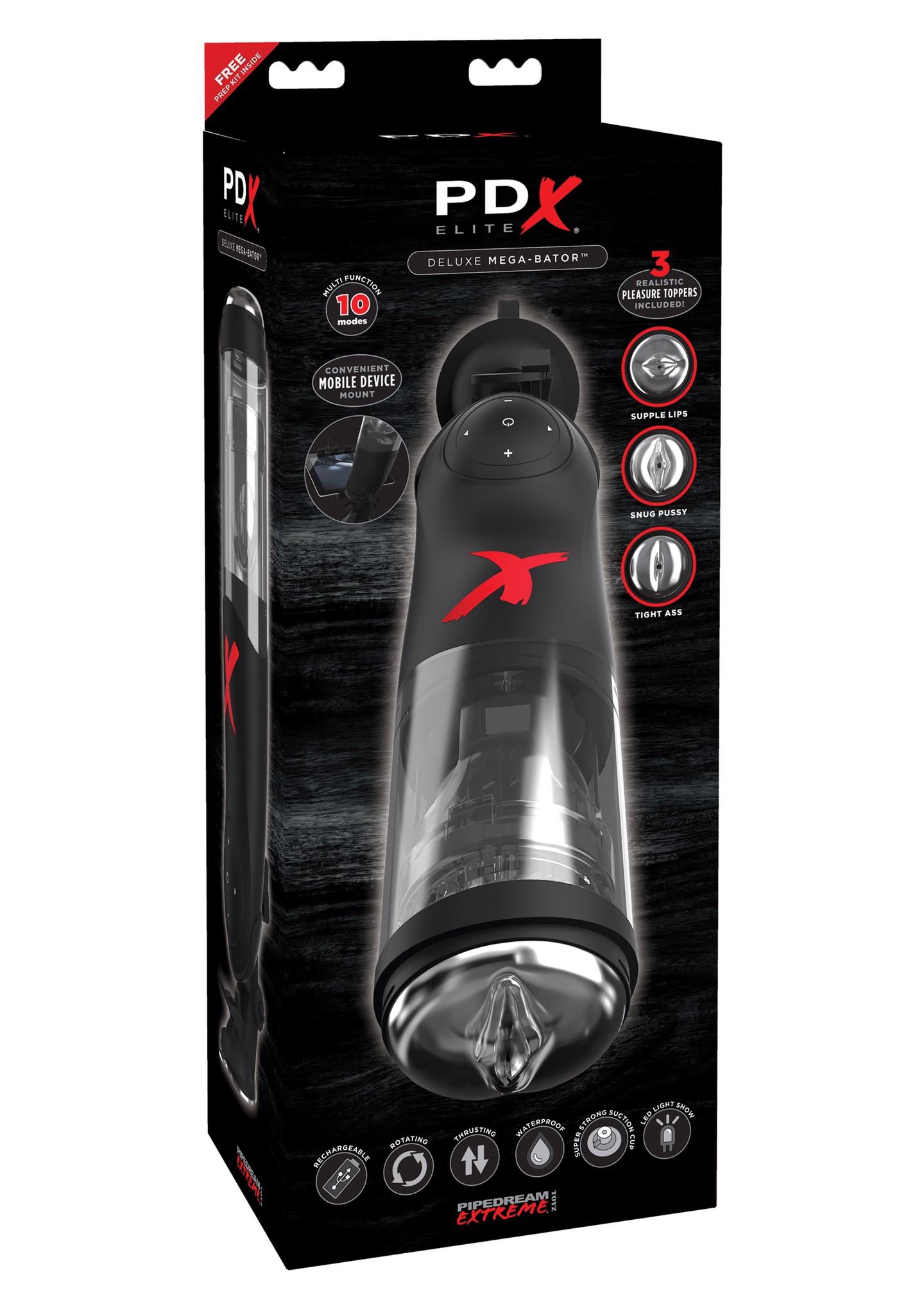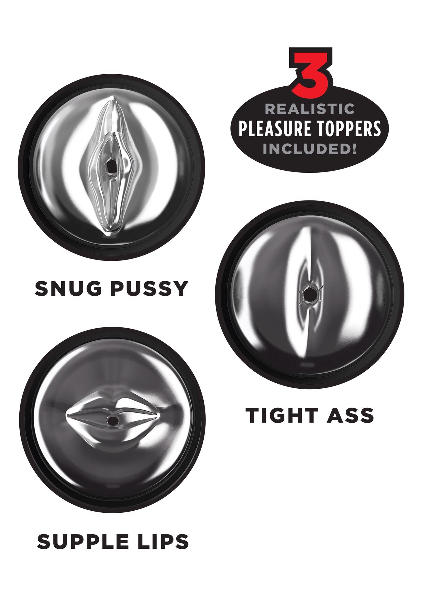 The Deluxe Mega-Bator is the only hands-free masturbator in the world that does all of the work for you, so you can experience the ultimate hands-free pleasure experience! The innovative Deluxe Mega-Bator combines hands-free rotation and thrusting that can be enjoyed in 10 unique patterns for completely customizable masturbation sessions.Enjoy the best of both worlds! Intense rotation combined with powerful piston-action thrusting – the innovative hands-free Deluxe Mega-Bator spins and thrusts you to explosive pleasure! With 3 interchangeable pleasure toppers you can enjoy a snug pussy, tight ass or supple lips depending on your mood. Slide through the realistic pleasure topper to enjoy a stimulating textured sleeve lined with rows of tiny ribs that tease your shaft with every thrust. The powerful motor ensures strong, steady rotation, piston-action thrusting, and exclusive sleeve suspension system will completely satisfy your entire penis, giving you the best stroker session you’ve ever had!
