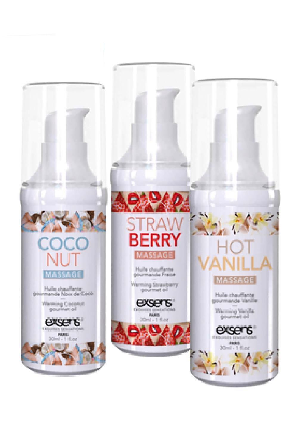 Book your tickets for paradise! This warming gourmet massage gel is ideal for foreplay. When applied to intimate areas,the gentle warming sensation and kissable flavor encourages touching and oral pleasures.Gentle warming sensationDelicious fruity flavorSugar freeTravel sizedNonstainingNo bitter aftertasteVeganGlow in the dark labelStrawberry, Hot Vanilla and Coconut flavorsIngredients (coconut, strawberry): glycerin, propylene glycol, aroma (flavor), sodium saccharinIngredients (hot vanilla): glycerin, propylene glycol, aroma (flavor), sodium saccharin, anise alcohol