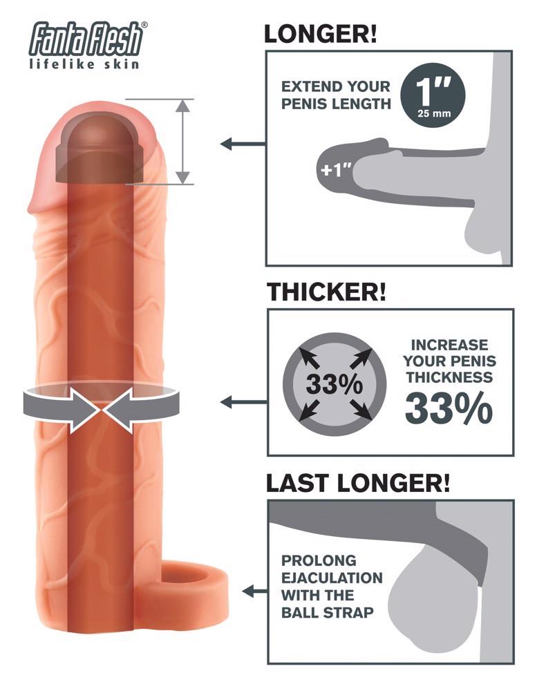 Powłoka penisa z mocnymi żyłkami i mocno wyściełanym żołędzią, która wydłuża penisa o 2,5 cm. Zagęszcza penisa o 33% i jednocześnie zapewnia wsparcie erekcji. Elastyczny pierścień jąder zapewnia szczególnie mocne przyleganie i cudowne uczucie chwytania.