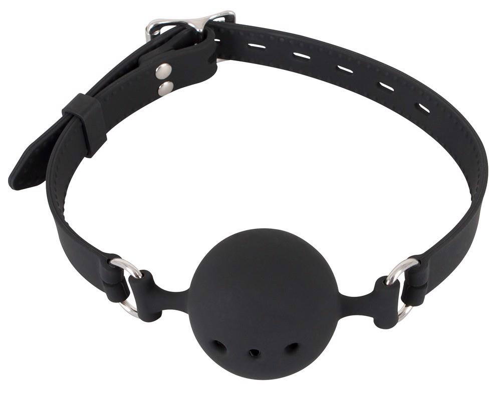 Czarny knebel w kształcie pierścienia na regulowanym pasku. Pierścień nie jest elastyczny i dlatego służy jako knebel do ust, średnica 5 cm. Materiał: silikon.