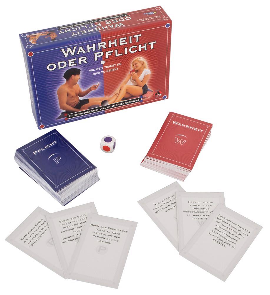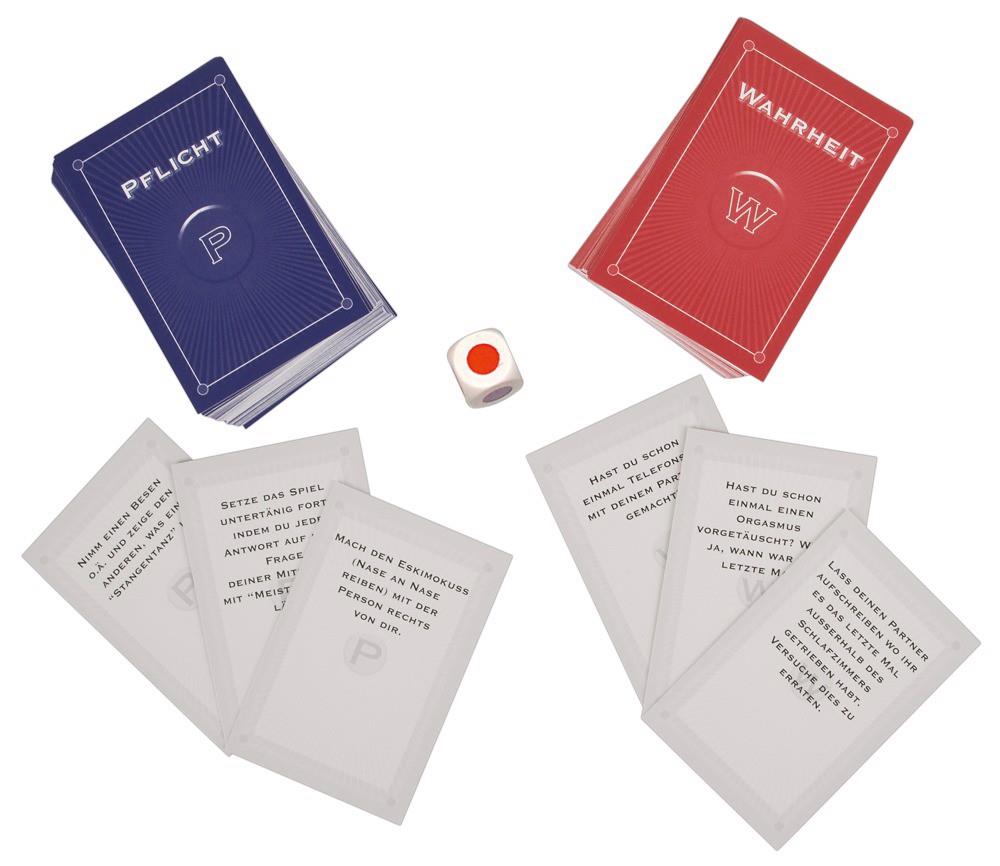 Top-Seller: Sprzedany już sto tysięcy razy! Kultowa erotyczna gra na długie wieczory imprezowe pozwala poznać swojego partnera lub innych graczy i tworzy erotyczną atmosferę. 75 intymnych pytań i 75 zaskakujących wyzwań sprawia, że gra jest pełna humoru, emocji i objawień. Bułka z masłem, która decyduje o tym, czy trzeba odpowiedzieć na intymne pytanie, czy też podjąć bezczelną akcję. Gra w karty dla 2-8 graczy. Zawartość: 1 kostka, 2 pale kart, każda z kartami “Duty” i “Truth”.