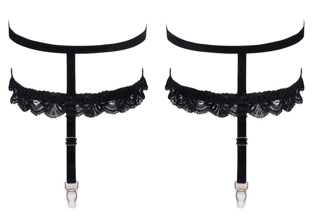 The black garters from Cottelli ACCESSORIES have removable suspender straps. They are made out of soft velvet and have silver-coloured rings and delicate lace. They are stretchy as well for a perfect fit. The suspender straps can adjusted. 1 pair.
