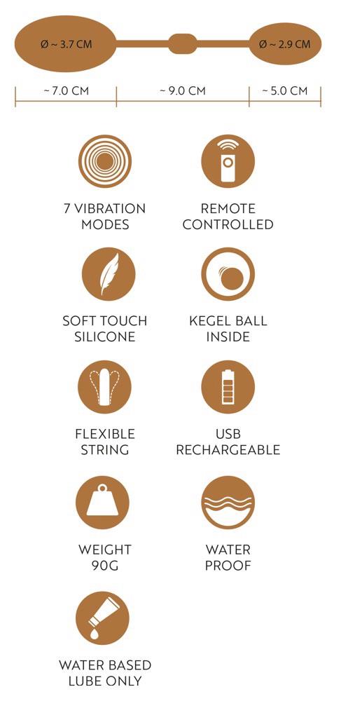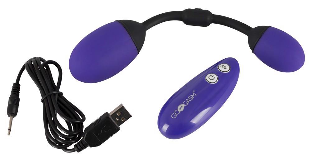 Kulki miłości Vibrating Pussy & Ass Balls marki GoGasm do anusa i waginy, połączone elastycznym silikonowym paskiem. Większa kulka wibruje, podczas gdy mała kulka zawiera zmysłowo kołyszący się ciężarek. Większy pocisk wkłada się po prostu do pochwy – a mniejszy do odbytu, tak że żaden pasek nie zwisa. 7 trybów wibracji może być kontrolowanych za pomocą pilota, który posiada również blokadę przycisków. Dyskretnie przenośny do codziennego użytku. Wodoodporny. W zestawie kabel USB do ładowania i bateria do pilota (1 x 23A).