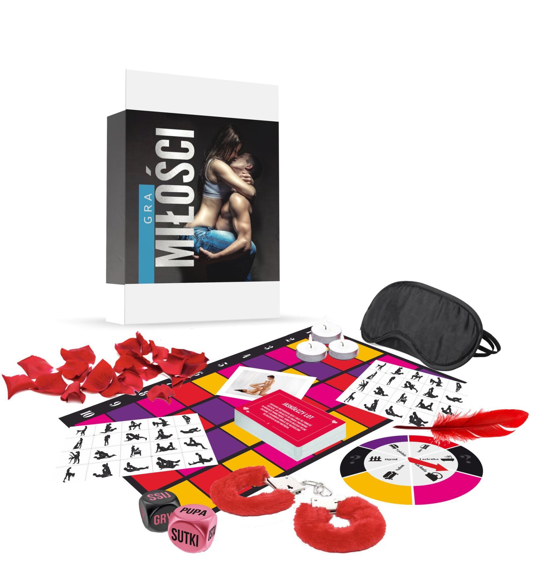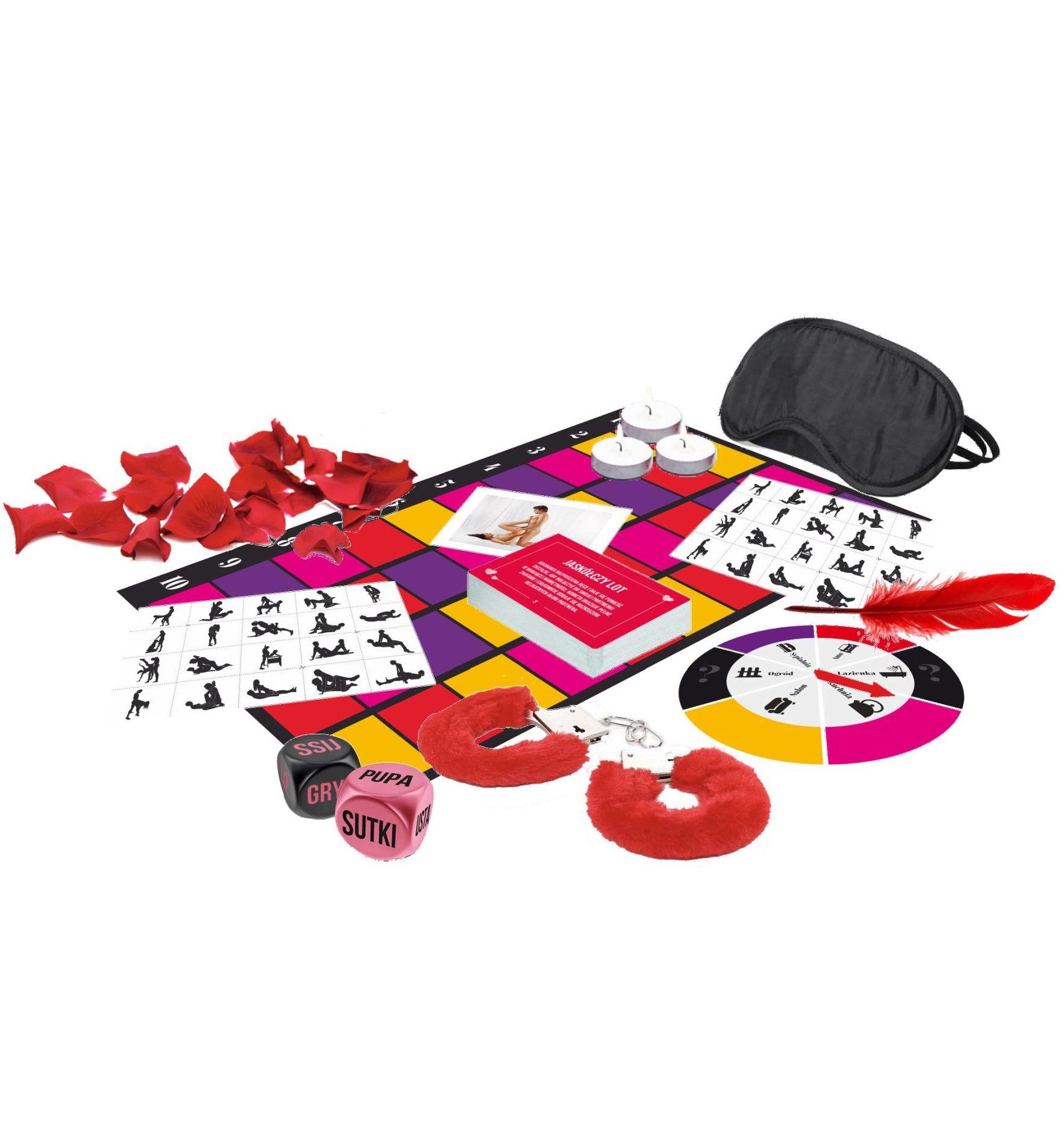 Koniec z rutyną w sypialni! Wypchany po brzegi , bogaty komplet erotyczny dla par, dzięki któremu nie będziecie mogli oderwać od siebie rąk a każda noc będzie bramą do nowych, rozkosznych doświadczeń. Gra planszowa gdzie wygrywamy pozycje miłosne do przećwiczenia, dodatkowo karty z pełnymi opisami i zdjęciami namiętnych pozycji ze sztuki Kamasutra, sex kości do losowania fantazyjnych poleceń, do tego masa gadżetów jak kajdanki czy płatki róż które urozmaicą sypialnie w dodatkowe atuty.