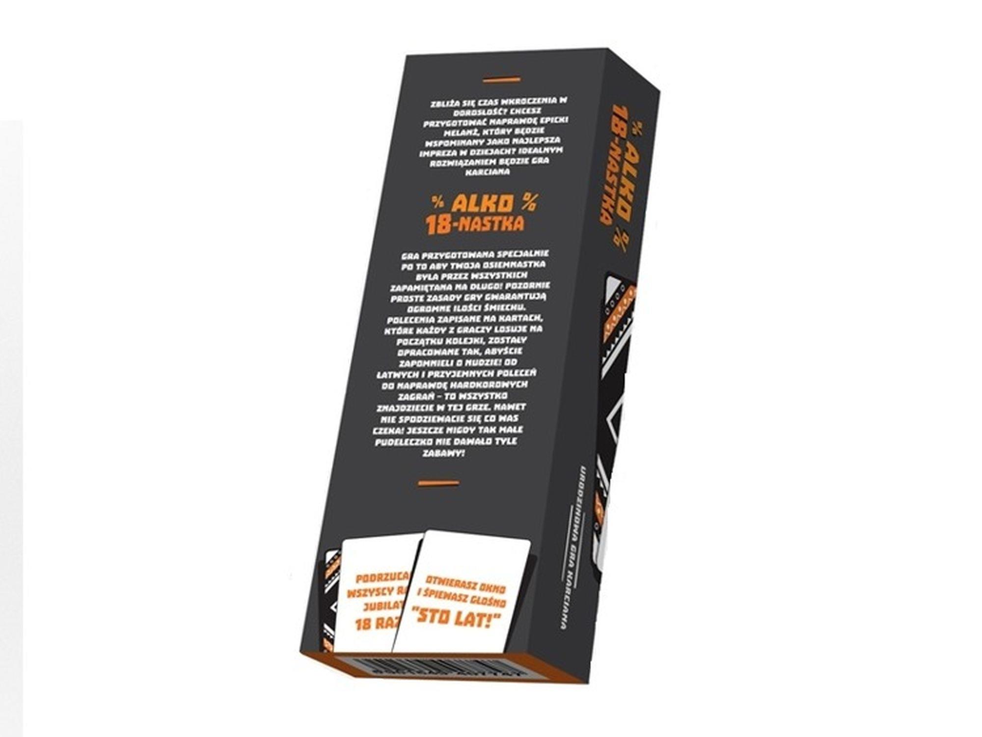 Gra przygotowana specjalnie po to aby Twoja osiemnastka była przez wszystkich zapamiętana na długo! Pozornie proste zasady gry gwarantują ogromne ilości śmiechu. Polecenia zapisane na kartach, które każdy z graczy losuje na początku kolejki, zostały opracowane tak, abyście zapomnieli o nudzie! Od łatwych i przyjemnych poleceń do naprawdę hardkorowych zagrań – to wszystko znajdziecie w tej grze.