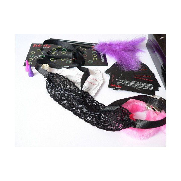 – Opaska oraz karty: przyjemności i rozkoszy (łącznie 42 sztuki kart). Opaską zasłonisz oczy lub skrępujesz partnera/partnerkę. Karty powiedzą Ci jakie ekscytujące zadania dziś przed Wami. Razem sprawią, ze oszalejecie z namiętności!