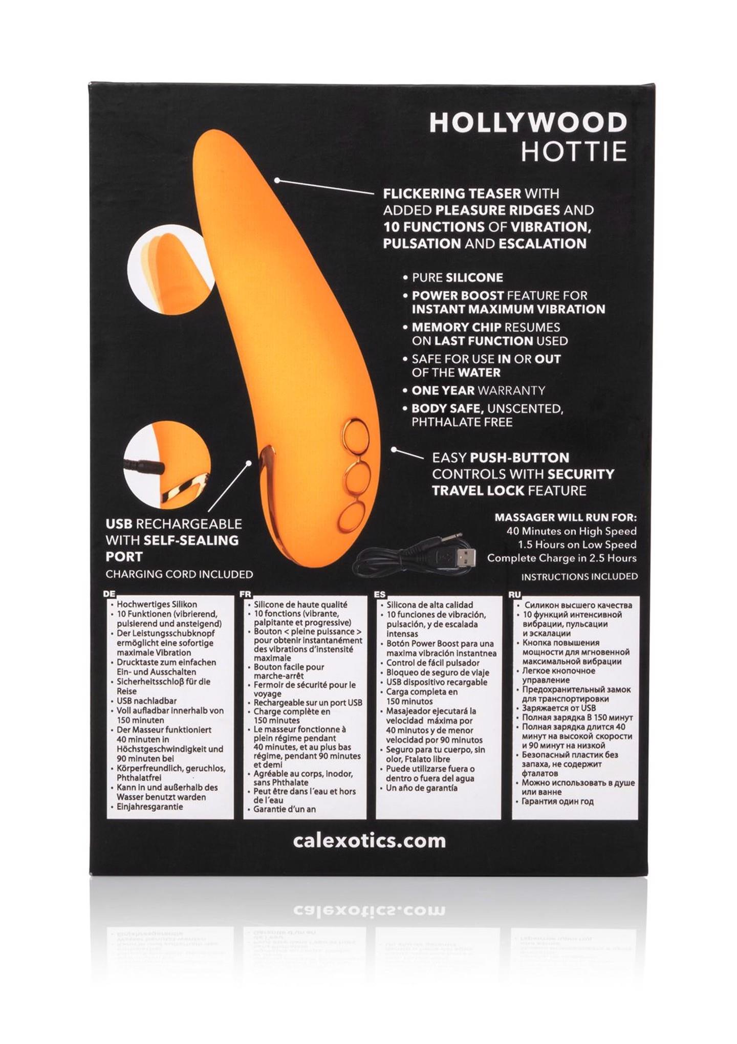 Indulge in wave after wave of pleasure as the California Dreaming Hollywood Hottie massager flickers against your most sensual sweet spots. The 10 intense vibration functions, plush silicone and flickering tip will make you feel like the star of the show. This mini massager fits close to your curves and enjoy full control over the indulgent vibrations and g-spot stimulating design. The curved vibrator is covered in a silky silicone and has a flickering tip for knee-shaking stimulation.Indulge personalized pleasure with the flexible massager body and 10 vivacious vibration, passionate pulsation and erotic escalation. Indulge in super-charged pleasure with the Power Boost function for intense vibrations. The easy-touch 2-button control lets you cycle through the knee-shaking settings or use the secure travel lock feature to let your passion takes you. Recharge the premium silicone vibrator in 2.5 hours with the provided USB charging cable to enjoy 40 minutes of high-speed stimulation or 90 minutes of low speed vibrations. While the easy-touch button controls the intensity and the vibe gives you the stimulation you want, the pliable body holds any position you desire. The self-sealing charging port and virtually seamless body let you get steamy with this waterproof vibe. The hypoallergenic premium silicone is body safe, unscented and phthalate free to keep you most sensitive spots, happy and healthy.
