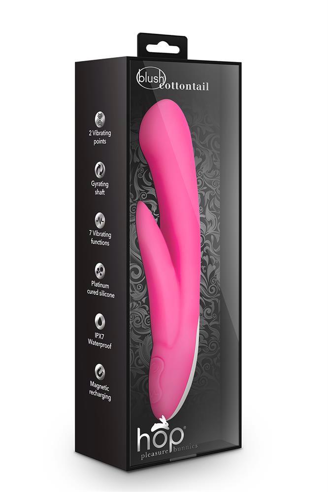 Seductively powerful, the Hop Cottontail has a gyrating shaft and 2 points of vibration. The independently controlled 3 gyrating speeds and 7 vibrating functions provide a broad range of sensations. The gyrating shaft vibrates at the tip for enhanced G spot stimulation when paired with the vibrating clitoral arm. The UltraSilk™ Silicone is silky smooth and delivers vibrations beautifully. Made of platinum cured silicone, the Hop Cottontail is body safe, phthalate-free, IPX7 waterproof and easy to clean. USB rechargeable, eco friendly, and no batteries required.Duo vibrator with 7 rumbly vibrating functionsWith 2 vibration points and 3 speed slow gyrating shaftIPX7 waterproof, submersible, for bathtime play and convenient cleaningUSB Magnetic rechargeable, cable includedMade from satin smooth, body safe siliconeContains no fragrances, phthalates, paraffins or latexLength 8.25 inch / 20,9 cmInsertable length 4.25 inch / 10,8 cmWidth 1.75 inch / 4,4 cm