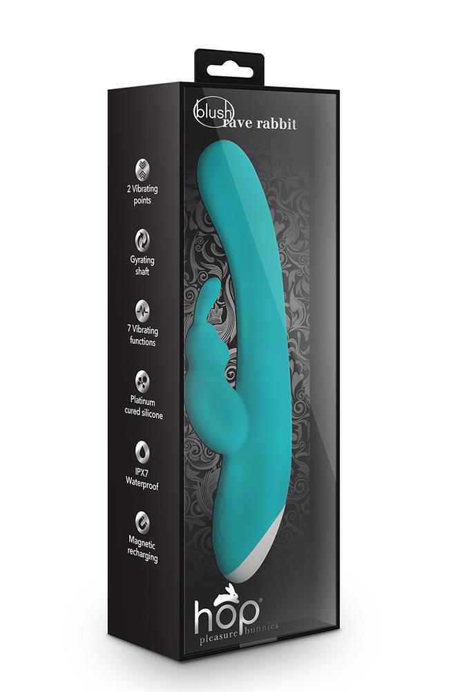 Seductively powerful, the Hop Rave Rabbit has a gyrating shaft and 2 points of vibration. The independently controlled 3 gyrating speeds and 7 vibrating functions provide a broad range of sensations. The gyrating shaft vibrates at the tip for enhanced G spot stimulation when paired with the vibrating clitoral arm. The UltraSilk™ Silicone is silky smooth and delivers vibrations beautifully. Made of platinum cured silicone, the Hop Rave Rabbit is body safe, phthalate-free, IPX7 waterproof and easy to clean. USB rechargeable, eco friendly, and no batteries required.Duo vibrator with 2 vibration points and 3 speed gyrating shaft7 Rumbly vibrating functionsIPX7 waterproof, submersible for bathtime play and convenient cleaningUSB magnetic recharging cable includedMade from satin smooth, body safe siliconeContains no fragrances, phthalates, paraffins or latexLength 8 inch / 20,3 cmInsertable length 4.5 inch / 11,4 cmWidth 1.2 inch / 3,0 cm