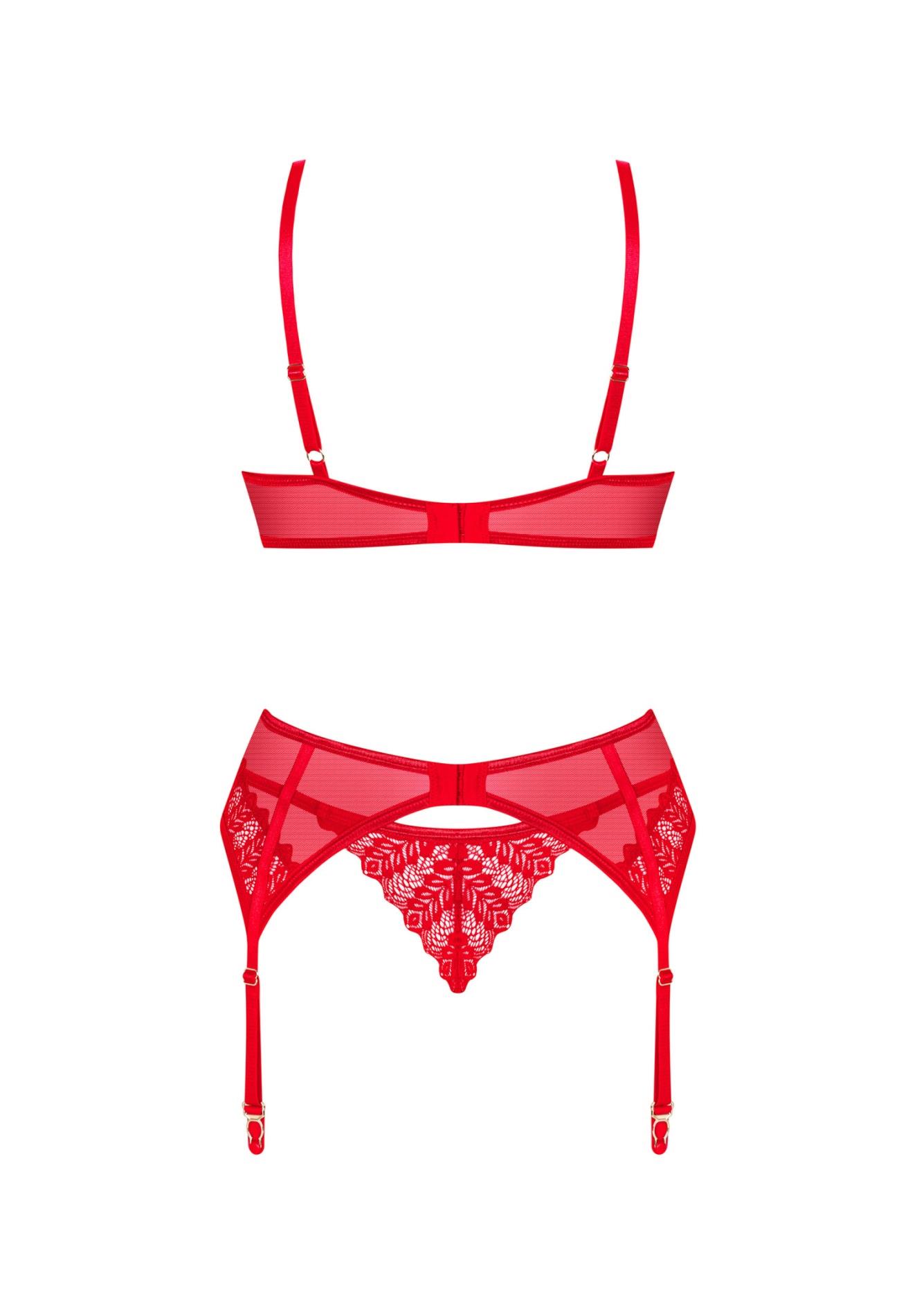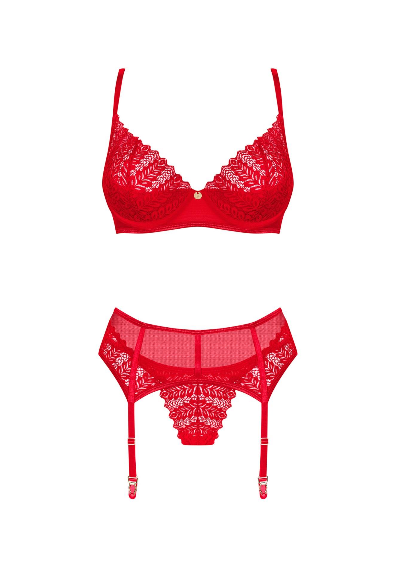 Wywołasz nieskrępowaną ekscytację na twarzy swojej drugiej połówki, gdy tylko pojawisz się w tym gorącym komplecie! Zakochaj się w niebanalnym designie z intrygującymi detalami. Czerwień biustonosza, stringów oraz pasa do pończoch nie pozwoli oderwać od Ciebie wzroku i sprawi, że poczujesz się wyjątkowo pięknie.