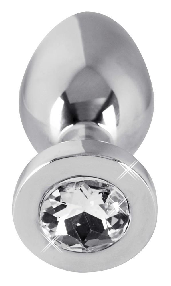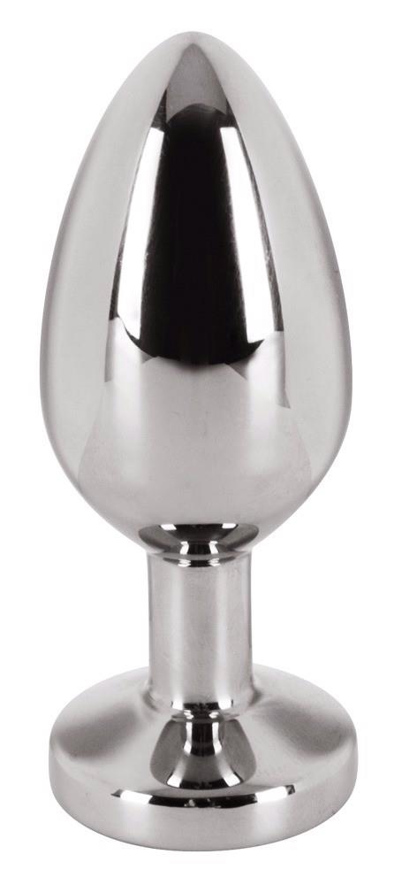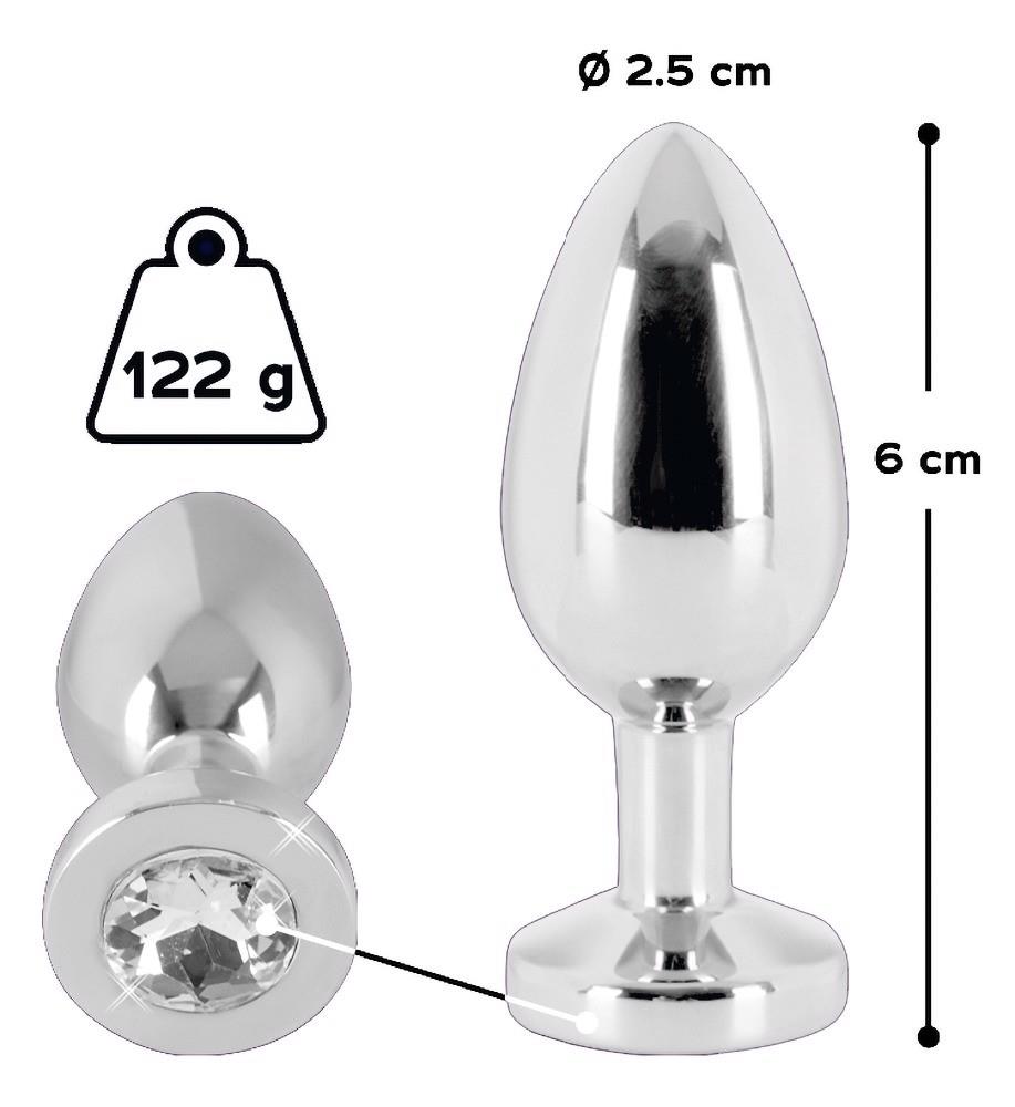Srebrny, stożkowaty korek analny w kształcie stożka z przezroczystym kamieniem szlachetnym na końcu. Długość całkowita 6 cm, średnica 2,5 cm. Waga: 122 g. Materiał: stal nierdzewna, szkło akrylowe (kamień).
