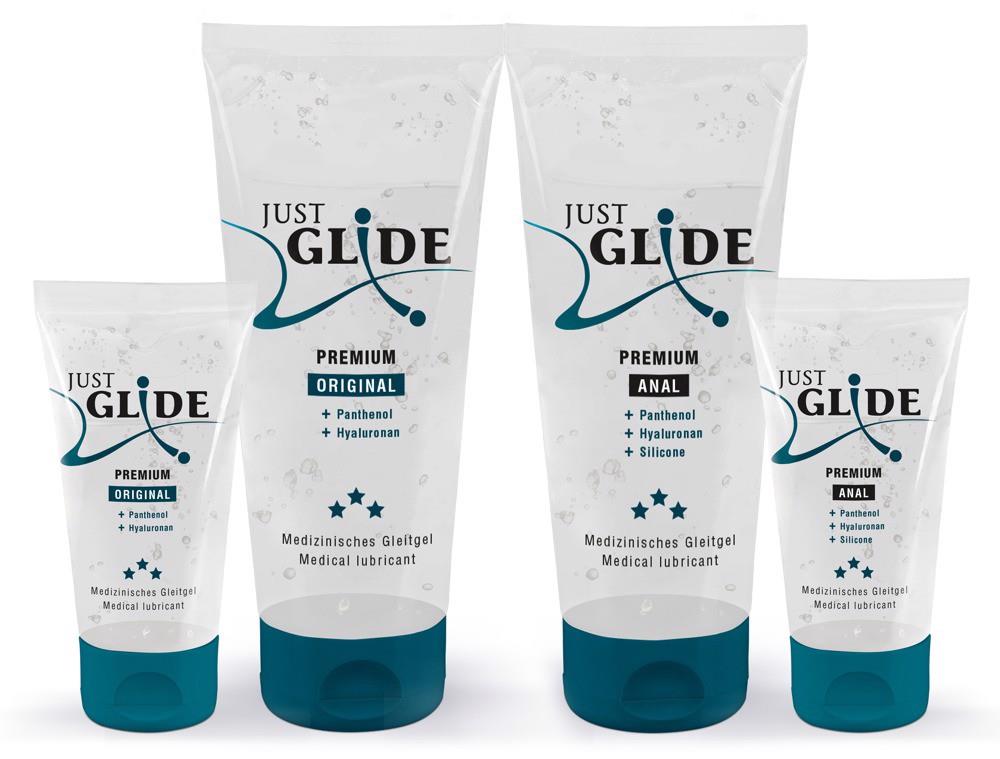Lubrykanty na bazie wody Premium i Premium Anal firmy Just Glide mają doskonałe, długotrwałe właściwości poślizgowe i dodatkowo pielęgnują kwasem hialuronowym i pantenolem. Kwas hialuronowy ma działanie nawilżające i tworzy wyjątkowo gładką konsystencję żelu. Zawarty pantenol ma działanie łagodzące i regenerujące barierę ochronną skóry. Oba smary są wegańskie, bezwonne i bezsmakowe. Premium Anal zawiera również olejek silikonowy dla doskonałej gładkości i nawilżenia, szczególnie w okolicach odbytu. Oba żele są łatwo zmywalne. Bezpieczny dla prezerwatyw lateksowych.
