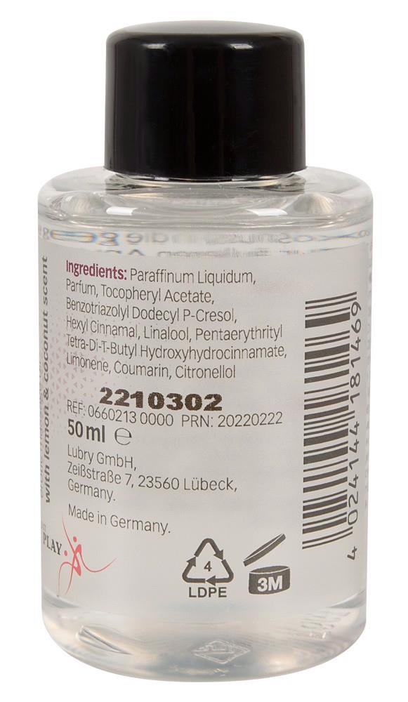 The Just Play erotic massage oil with its exciting, exotic lemon-coconut scent delights all senses and awakens erotic passions during a partner massage. Very rich. Vegan. 50 ml. For external use only.