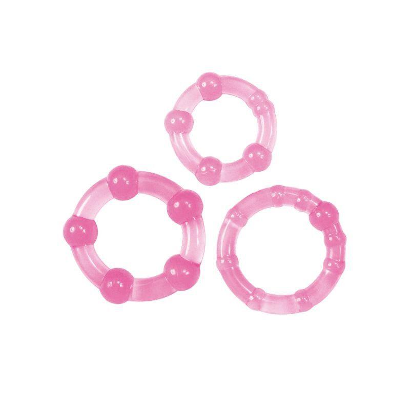 Zestaw 3 elastycznych pierścieni fallicznych z TPE, o różnych rozmiarach (od 1,8 do 2,3 cm średnicy z możliwością rozszerzenia do 3,6) i różowym kolorze. Bez ftalanów.