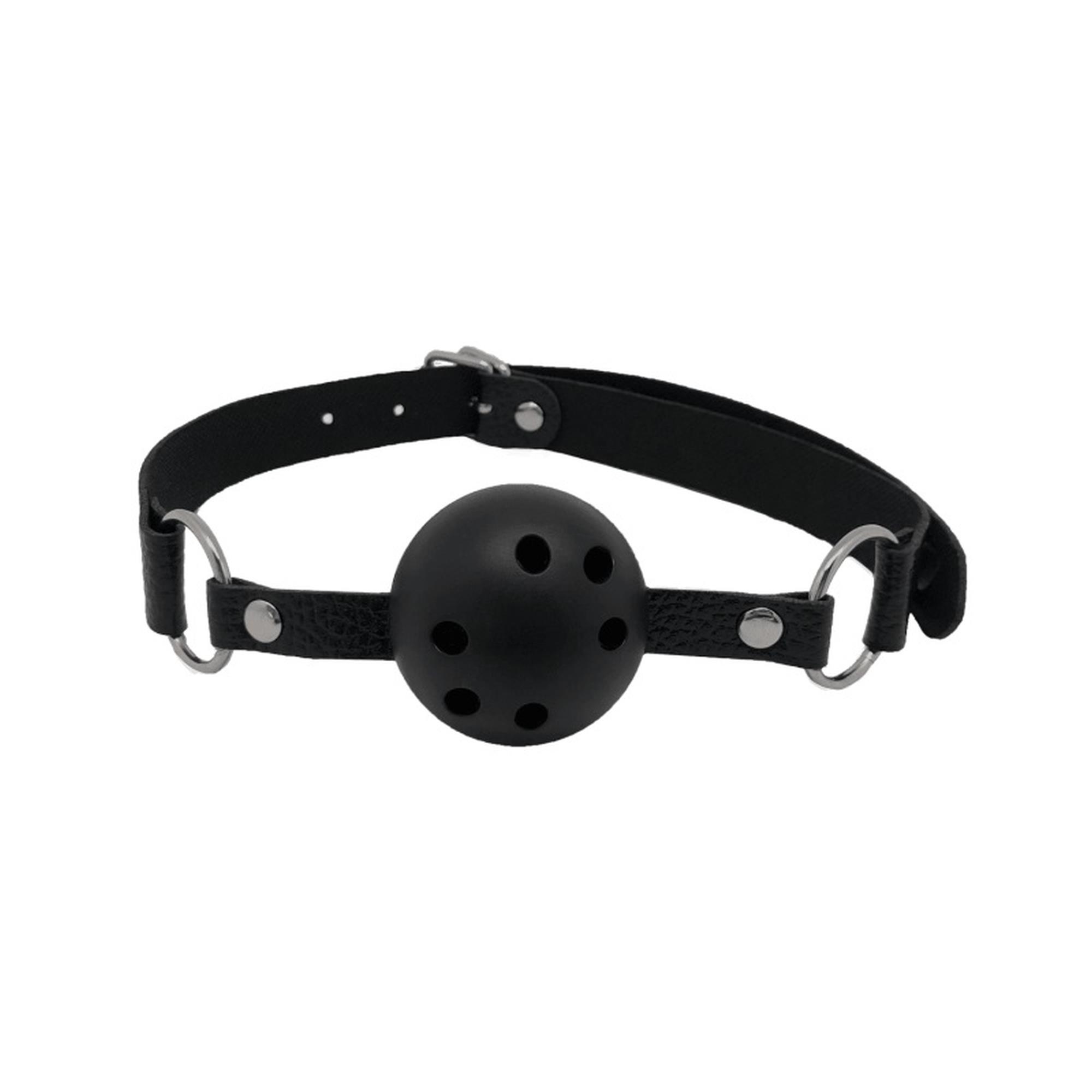 Czarny knebel z otworami ułatwiającymi oddychanie, kulka ma średnicę 4,5 cm i jest wykonana ze sztywnego ABS , pasek jest regulowany od 40 do 72 cm.