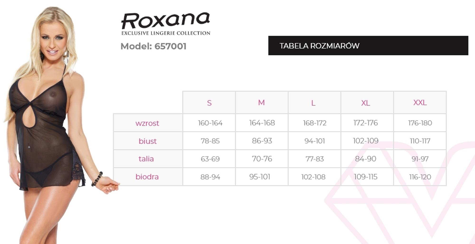 Urocza i zarazem seksowna koszulka nocna Roxana to minimalistyczny i bardzo ponętny komplet, idealny na upojne noce. Koszulka posiada głęboki dekolt w V, który pięknie eksponuje biust, nadając mu spektakularnego wyglądu. Urocze wycięcie w kształcie łezki pod biustem sprawia, że ta nocna kreacja wygląda jeszcze bardziej seksownie. Poczuj się swobodnie i kusząco! Prześwitujący materiał, wykonany z elastycznej siateczki pięknie prezentuje kobiece kształty. Ramiączko na szyi eksponuje plecy oraz ramiona sprawiając, że całość kompletu jest bardzo kobieca. W zestawie znajdują się również mocno wycięte stringi, które pięknie podkreślają nogi i je wysmuklają. Po bokach koszulka posiada piękne, koronkowe wstawki, nadające całości eleganckiego wyglądu. To wspaniała propozycja na co dzień oraz na specjalne okazje, np. na Walentynki. Ten seksowny komplet pozwoli Ci poczuć się swobodnie, a jednocześnie wyjątkowo kobieco.