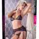 Ten trzyczęściowy zestaw do zawieszania uwodzi delikatną kwiatową koronką. Biustonosz z regulowanymi ramiączkami urzeka detalami na ramiączkach przy dekolcie oraz ekscytującymi miseczkami z rozcięciami – podkreślonymi ozdobnym pierścieniem ozdobnym. Pasujący pas do szelki jest wąsko wycięty i ma regulowane szelki. Obie części bielizny są zamykane z tyłu praktycznym klipsem. Zespół jest zakończony całkowicie otwartym smyczkiem.
