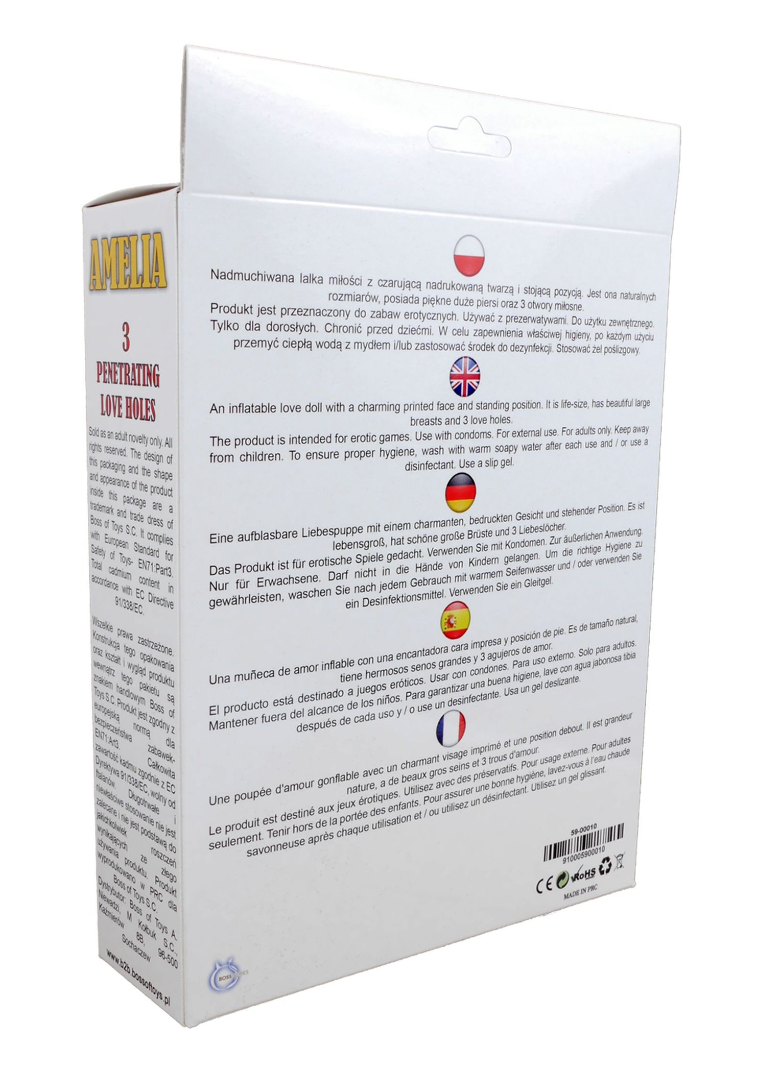 Piękna nadmuchiwana lalka miłości z czarującą nadrukowaną twarzą i stojącą pozycją, która kusi i wzbudza sensację. Jest ona naturalnych rozmiarów, posiada duże piękne piersi i 3 kuszące dziurki miłosne.