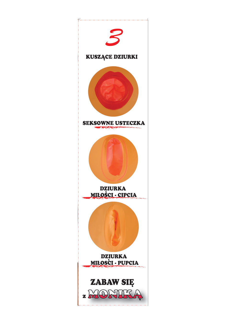 Monika – lalka miłości. Piękna nadmuchiwana lalka miłości z czarującą nadrukowaną twarzą i stojącą pozycją, która kusi i wzbudza sensację. Jest ona naturalnych rozmiarów, posiada piersi i 3 kuszące dziurki miłosne, w których można umieścić penisa.