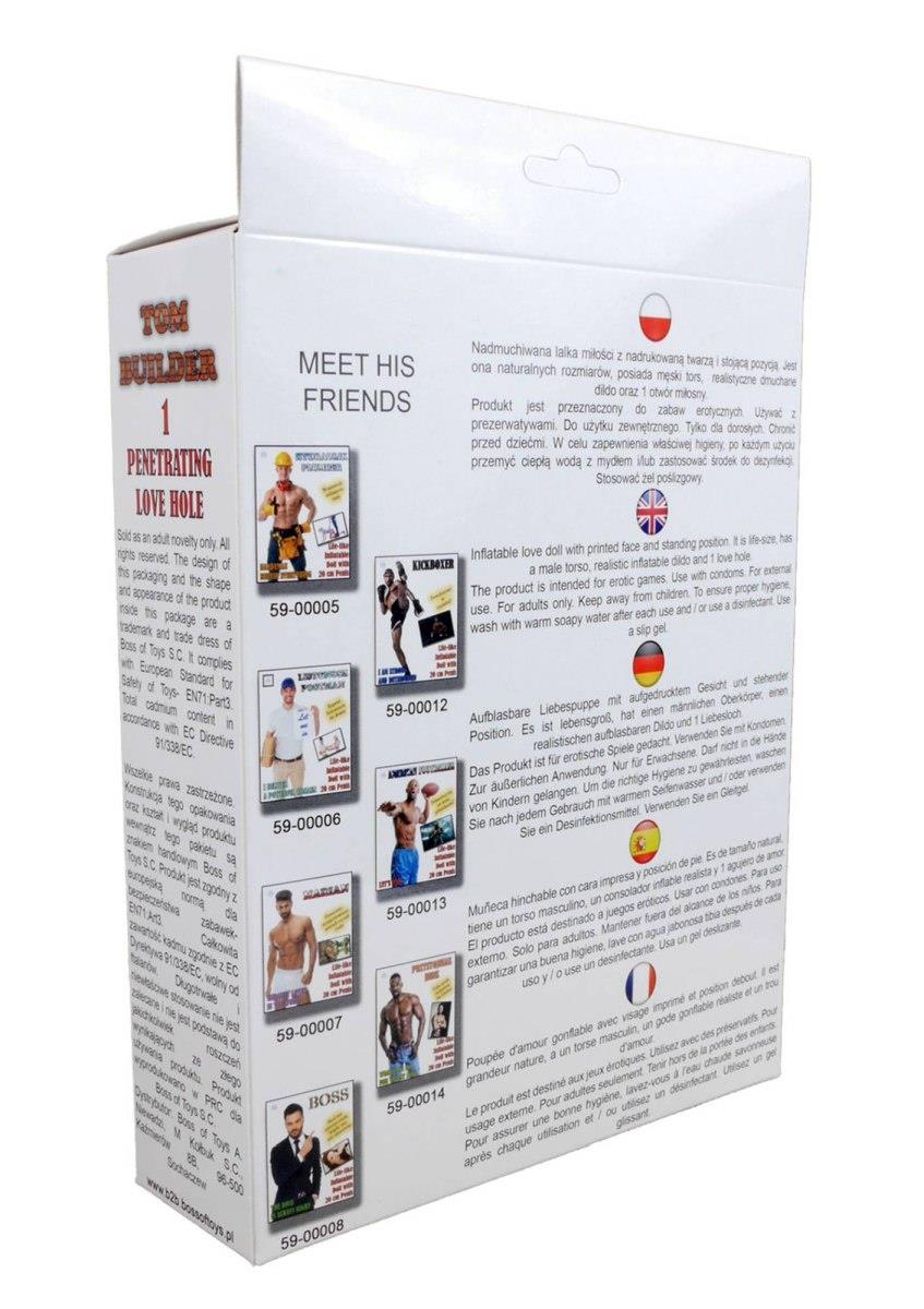Nadmuchiwana lalka miłości z nadrukowaną twarzą i stojącą pozycją (165 cm). Jest ona naturalnych rozmiarów, posiada męski tors, Lalka posiada 1 otwór analny.