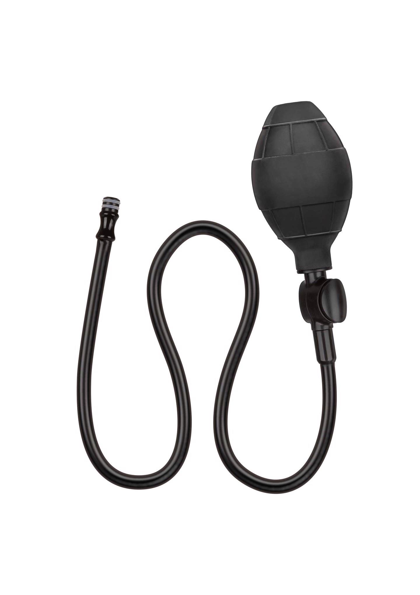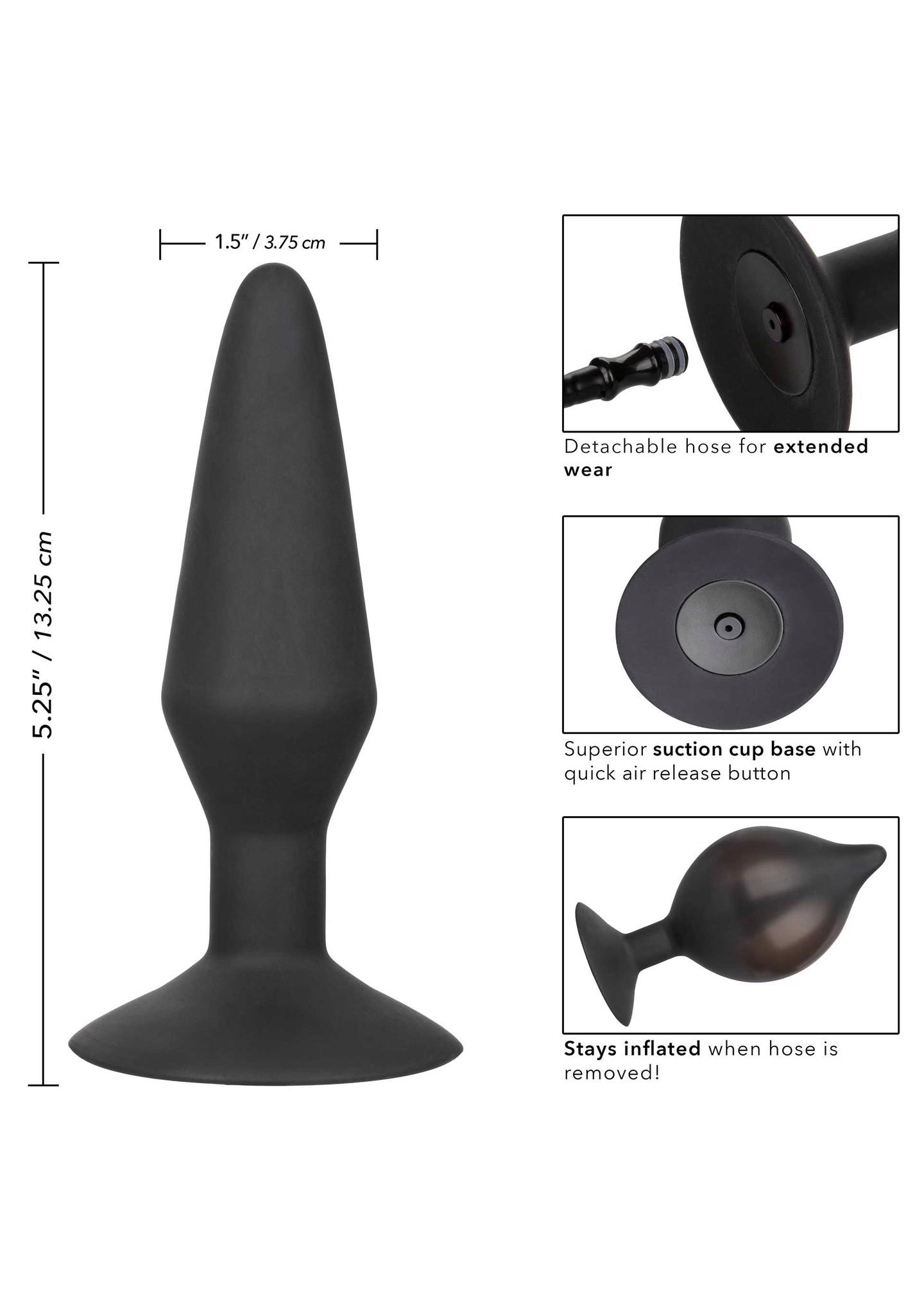 The CalExotics Large Silicone Inflatable Plug is a one-of-a-kind anal probe with inflatable body, easy squeeze bulb and detachable hose. The wickedly thrilling probe even stays inflated when the hose is detached! To inflate your ecstasy, simply attach the hose and press the easy squeeze bulb. Once you’ve reached the desired size, the probe will hold its size even when the hose is removed and the quick air release button allows for gentle deflation and removal. To enjoy the exhilarating world of anal pleasure to the fullest, easy insertion and sensual stimulation is the key to success. The tapered silicone probe has the perfect amount of flex to bend and move naturally with your body.The powerful suction cup base is perfect for creative pleasure play, the probe can be used with or without a harness or mount onto a flat surface for a wickedly good time. The flexible probe, hose and bulb are made from a seamless silicone with ABS plastic release valves. The silicone plug has an overall size of 5.25” x 1.5” (13.25 cm x 3.75 cm).