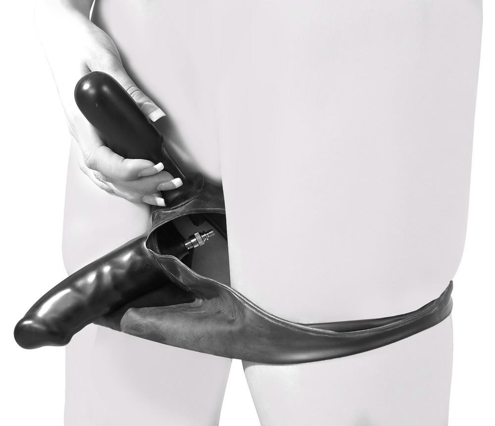 Lateksowe slipy, w środku nadmuchiwane podwójne dildo. Oba dilda wykonane są z lateksu. Pompa w zestawie.