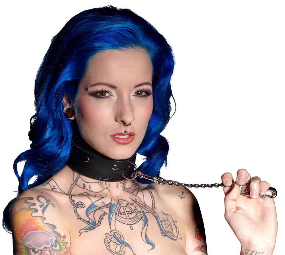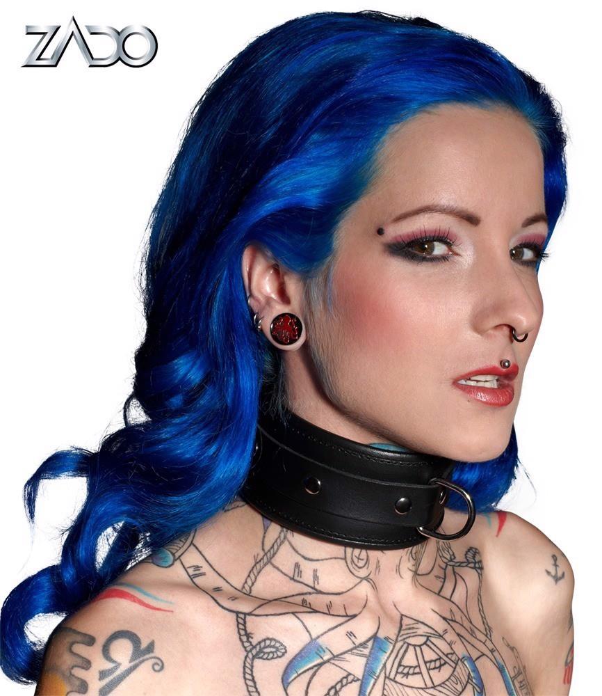 Wyściełany mankiet na szyi z obrzeżami. Z przodu z D-ringiem. Czarny. Regulowany z zapięciem na klamrę. Materiał: dwoina skórzana, metal.