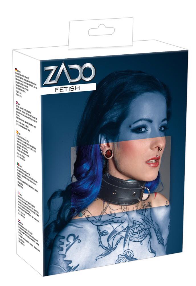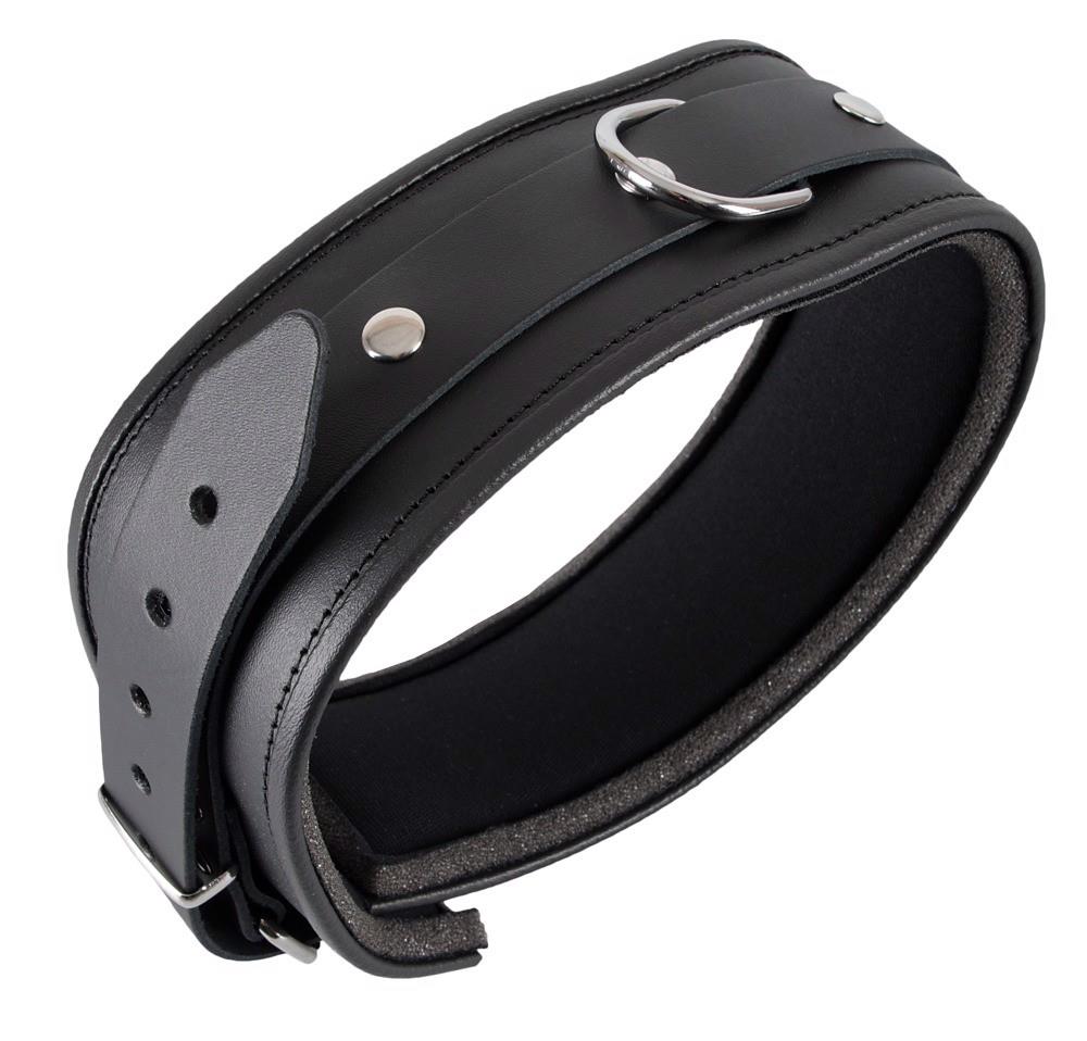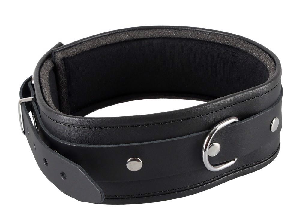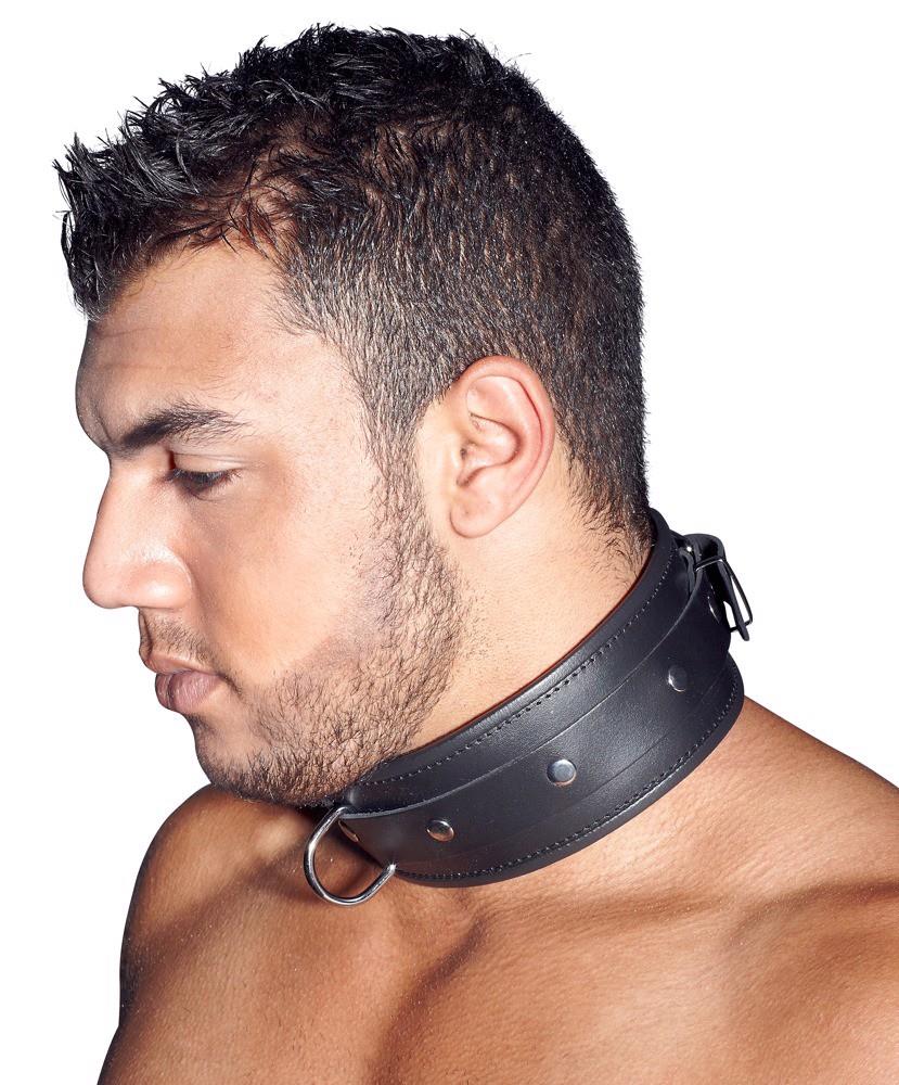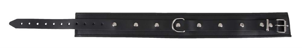 Wyściełany mankiet na szyi z obrzeżami. Z przodu z D-ringiem. Czarny. Regulowany z zapięciem na klamrę. Materiał: dwoina skórzana, metal.