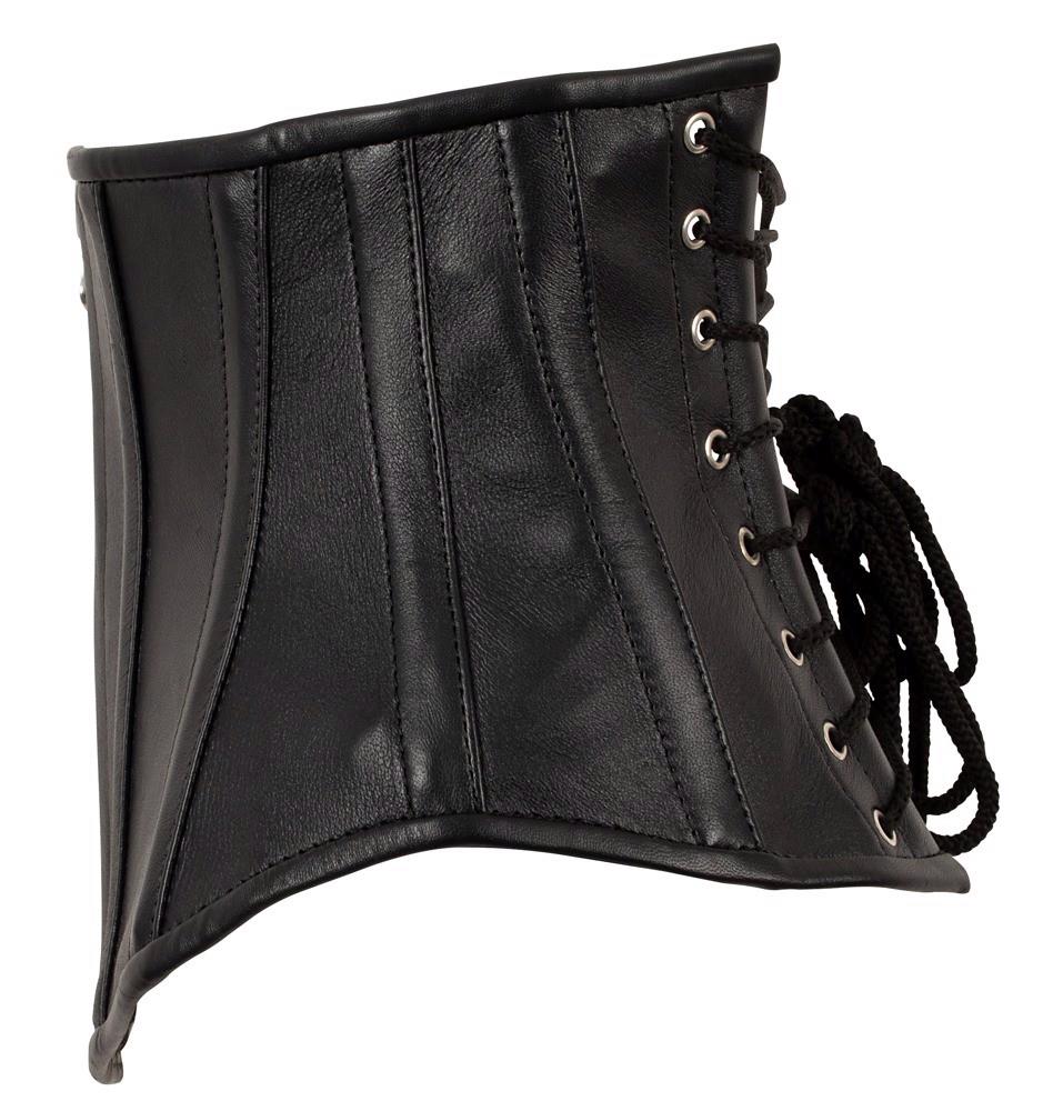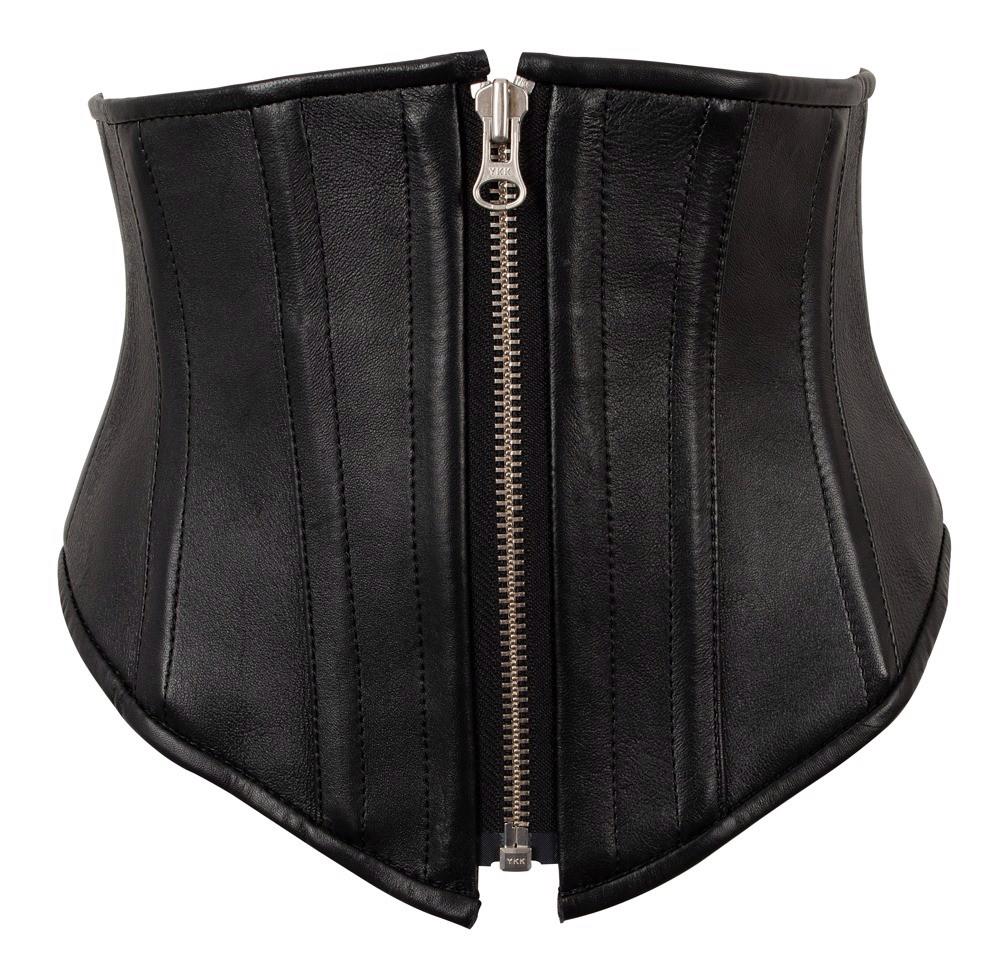 Czarny gorset w talii wykonany z jagnięcej skóry nappa z zamkiem błyskawicznym z przodu i sznurowaniem z tyłu. Przyjemne kształtowanie talii przez pręty. Dobrze nadaje się na prywatne spotkania, ale także na wizytę w klubie nocnym lub swingerskim.