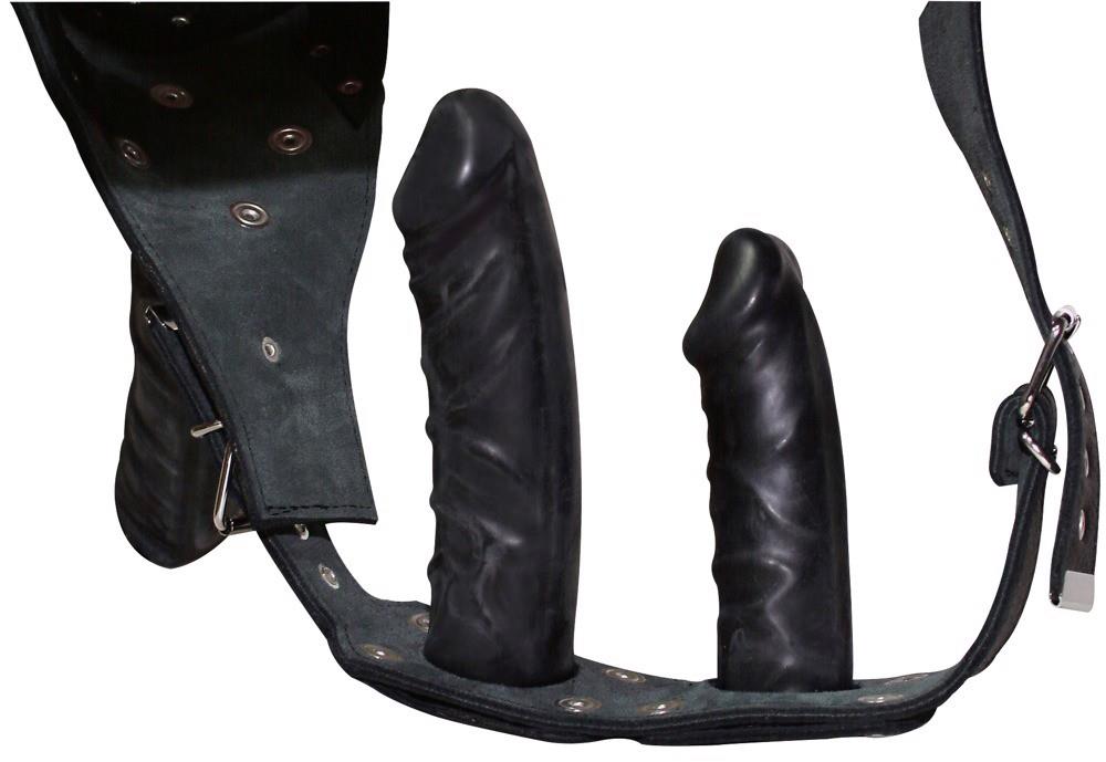 Skórzane stringi z trzema odczepianymi lateksowymi dildami: na zewnątrz wspaniałe dildo do rozkosznych pchnięć, a wewnątrz dwa dilda dla własnej przyjemności wypełniania.