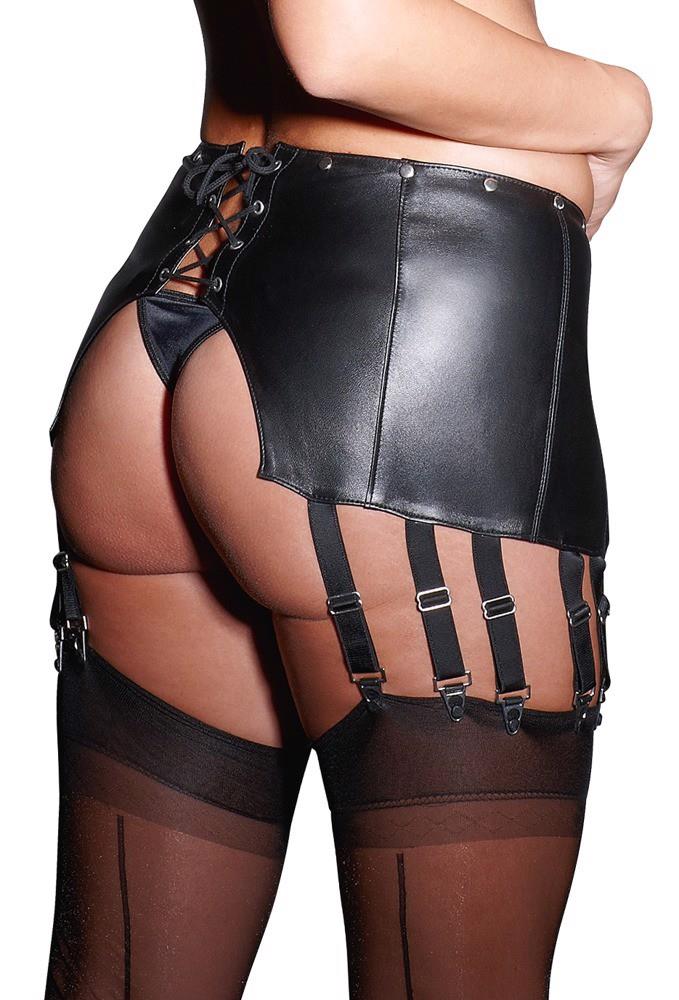 Czarny, szeroki pas do pończoch wykonany z miękkiej skóry jagnięcej nappa, z zamkiem błyskawicznym z przodu i sznurowaniem z tyłu. Z 6 regulowanymi szelkami po każdej stronie i ozdobnymi nitami w pasie. Szczególnie rozkoszne podczas stosunku, gdyż przód i tył mają szerokie rozcięcie, a paski do pończoch opierają się o boki nóg.