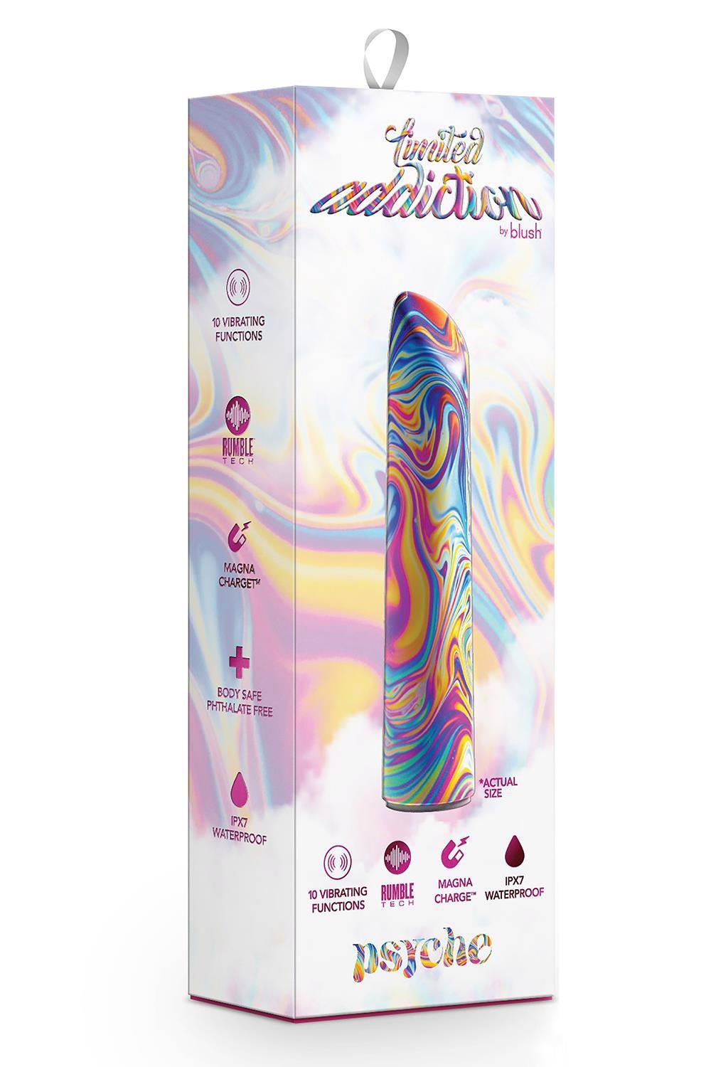 Are you ready for your newest addiction? The Limited Addiction Psyche Power Vibe is a colorful and sleek vibrator that delivers 10 deep, rumbly vibrations with the superior Rumble Tech™ motor! Cycle through 5 powerful speeds and 5 unique and thoughtfully curated patterns using the two button design to find your perfect pleasure preference. IPX7 submersible waterproof for bath and shower play and USB magnetic rechargeable, the Psyche Power Vibe is easy to clean and even easier to use. It has a smooth, sensual satin feel and it contains no phthalates, paraffins, latex, or fragrance.Limited Addiction – Psyche – Power Vibe – RainbowRumble Tech powered deep rumbly vibrations10 Thoughtfully designed vibration modes5 Speeds. 5 unique patternsSmooth sensual satin feel2 Way controls to conveniently and quickly get to your favorite settingIPX7 WaterproofConvenient Magna Charge USB charging tech: charges magneticallyLength 4 inch / 10,1 cmWidth 0.9 inch / 2,3 cm