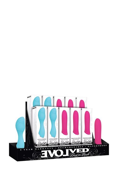 Counter display set of 2 popular vibes, the Little Dipper and the Pretty in Pink. Comes with 2 additional tester vibes. Little Dipper silicone vibe is a compact rechargeable vibe with a unique, fun swirl shape. Pretty in Pink is an extremely powerful, discreet bullet with a sleek, gently rounded design.