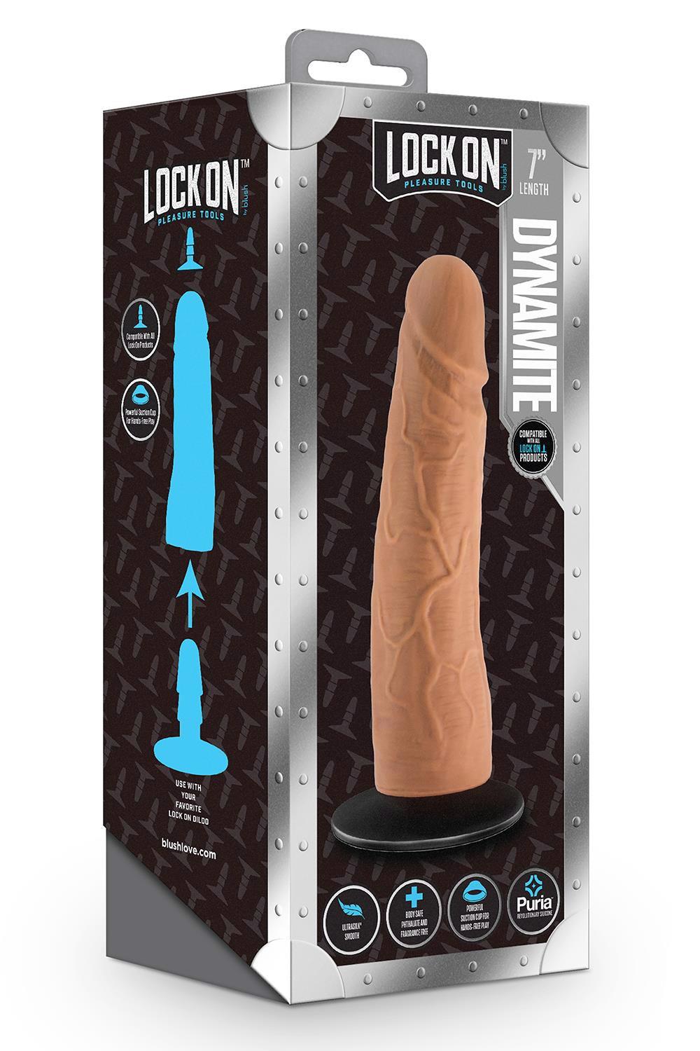 The Lock On Dynamite Dildo is a versatile dildo that delivers a realistic feel, with skin-like and veiny textures for extra sensation. Dynamite is compatible with ALL Lock On systems so you can create your own adventure, or utilize the included removable suction cup for hands-free play and further accessibility! Harness compatible and Ultrasilk® smooth, Dynamite has everything you need in a realistic dildo. Made of Puria™ superior platinum-cured silicone, Dynamite is body-safe, phthalate free, latex free, fragrance free, and easy to clean!Compatible with all Lock On systems to personalize your pleasureIncluded removable suction cup for hands free play and accessibilityMeticulously handcrafted for a realistic look and better than real feelPure platinum cured Puria™ siliconeUltrasilk® smoothWater based, hybrid lube safeLength 7 inch / 17,7 cmInsertable length 7 inch / 17,7 cmWidth 2 inch / 5 cm