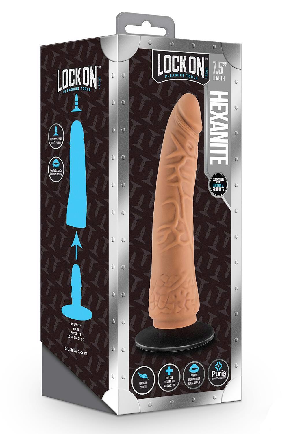 The Lock On Dynamite Hexanite is a versatile dildo that delivers a realistic feel, with skin-like and veiny textures for extra sensation. Hexanite is compatible with ALL Lock On systems so you can create your own adventure, or utilize the included removable suction cup for hands-free play and further accessibility! Harness compatible and Ultrasilk® smooth, Hexanite has everything you need in a realistic dildo. Made of Puria™ superior platinum-cured silicone, Hexanite is body-safe, phthalate free, latex free, fragrance free, and easy to clean!Compatible with all Lock On systems to personalize your pleasureIncluded removable suction cup for hands free play and accessibilityMeticulously handcrafted for a realistic look and better than real feelPure platinum cured Puria™ siliconeUltrasilk® smoothWater based, hybrid lube safeLength 7.5 inch / 19 cmInsertable length 7.5 inch / 19 cmWidth 2 inch / 5 cm