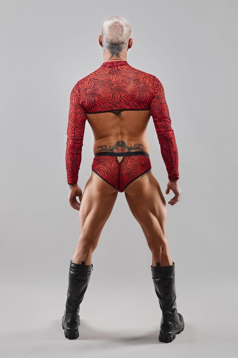 Majtki typu brazyliany. W całości stworzone z elastycznego i sprężystego tiulu w kolorze czarno-czerwonej zebry. W pasie czarna, szeroka i miła w dotyku gumka. Z przodu pod tiulem wstawka z czarnego, błyszczącego vinylu. Nadaje efektu optycznego powiększenia oraz efektownego wyglądu.
