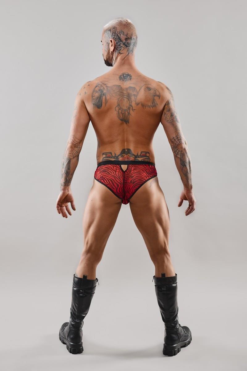 Majtki typu brazyliany. W całości stworzone z elastycznego i sprężystego tiulu w kolorze czarno-czerwonej zebry. W pasie czarna, szeroka i miła w dotyku gumka. Z przodu pod tiulem wstawka z czarnego, błyszczącego vinylu. Nadaje efektu optycznego powiększenia oraz efektownego wyglądu.