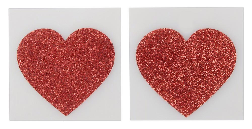 Błyszczące czerwone serduszka na sutki do naklejenia. Na odwrocie za pomocą pasków samoprzylepnych.