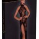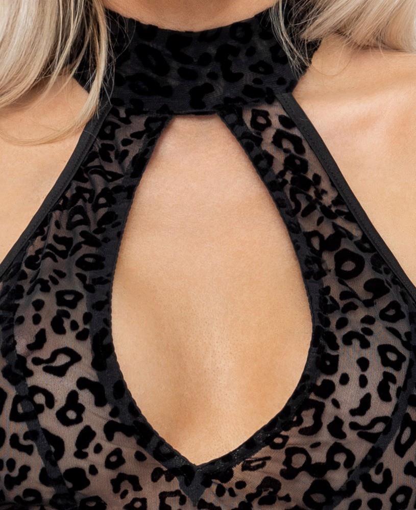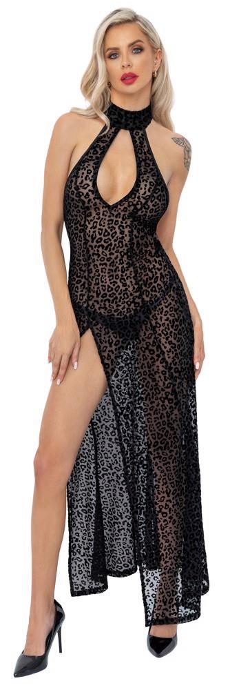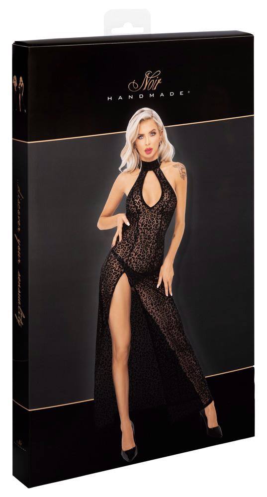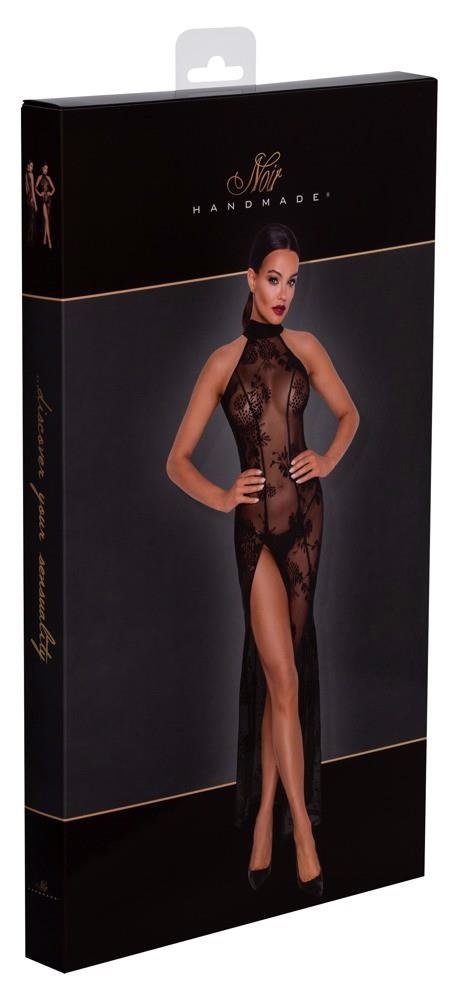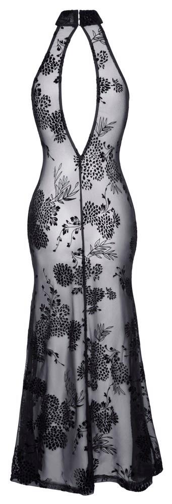 Long off-the-shoulder halterneck dress by Noir made entirely from fine black stretch mesh with a velvet flock print in a floral tendril look. Deep waterfall neckline at the front under the narrow halterneck with hook fastening. Exciting slit up to the hips. Open at the back up to the bum!