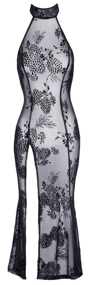 Long off-the-shoulder halterneck dress by Noir made entirely from fine black stretch mesh with a velvet flock print in a floral tendril look. Deep waterfall neckline at the front under the narrow halterneck with hook fastening. Exciting slit up to the hips. Open at the back up to the bum!
